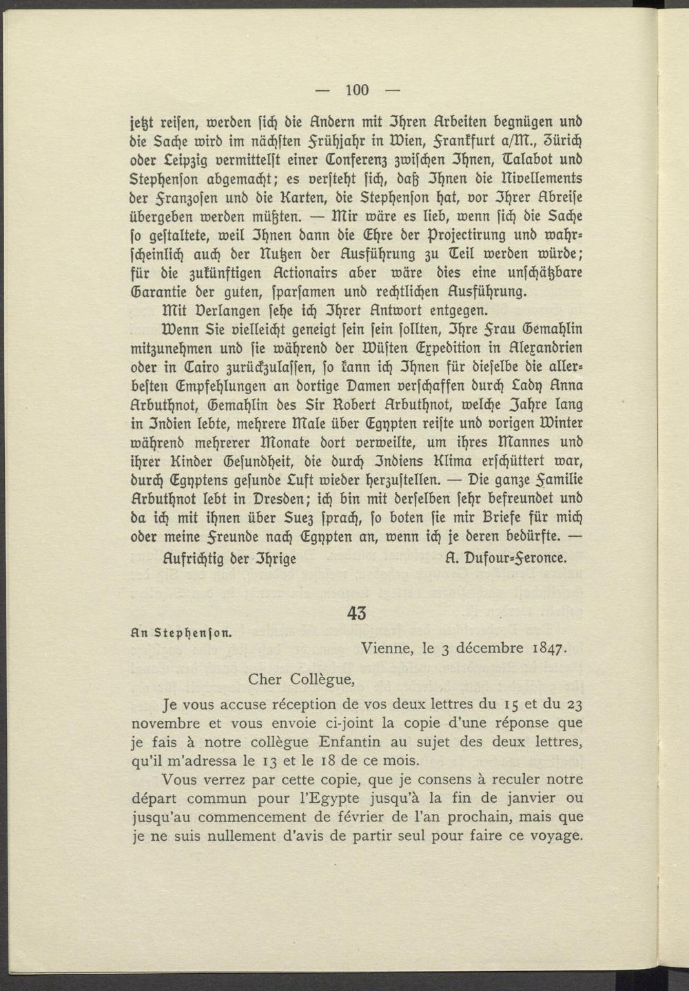 Wenn Sie vielleicht geneigt sein sein sollten, Ihre Frau Gemahlin mitzunehmen und sie während der Wüsten Expedition in Alexandrien oder in Cairo zurückzulassen, so kann ich Ihnen für dieselbe die allerbesten Empfehlungen an dortige Damen verschaffen durch Lady Anna Arbuthnot, Gemahlin des Sir Robert Arbuthnot, welche Jahre lang in Indien lebte, mehrere Male über Egypten reiste und vorigen Winter während mehrerer Monate dort verweilte, um ihres Mannes und ihrer Kinder Gesundheit, die durch Indiens Klima erschüttert war, durch Egyptens gesunde Luft wieder herzustellen. Die ganze Familie Arbuthnot lebt in Dresden; ich bin mit derselben sehr befreundet und da ich mit ihnen über Suez sprach, so boten sie mir Briefe für mich oder meine Freunde nach Egypten an, wenn ich je deren bedürfte. Aufrichtig der Thrige A. Dufour- Feronce.