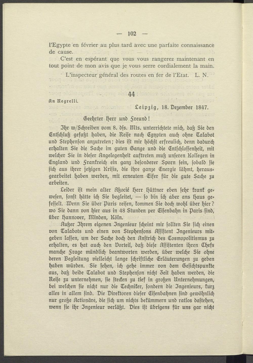 Ihr w/ Schreiben vom 8. dss. Mts. unterrichtete mich, daß Sie den Entschluß gefaßt haben, die Reise nach Egypten auch ohne Talabot und Stephenson anzutreten; dies ist mir höchst erfreulich, denn dadurch erhalten Sie die Sache im guten Gange und die Entschlossenheit, mit welcher Sie in dieser Angelegenheit auftreten muß unseren Kollegen in England und Frankreich ein ganz besonderer Sporn sein, sobald sie sich aus ihrer jetzigen Krisis, die ihre ganze Energie lähmt, herausgearbeitet haben werden, mit erneutem Eifer für die gute Sache zu arbeiten.