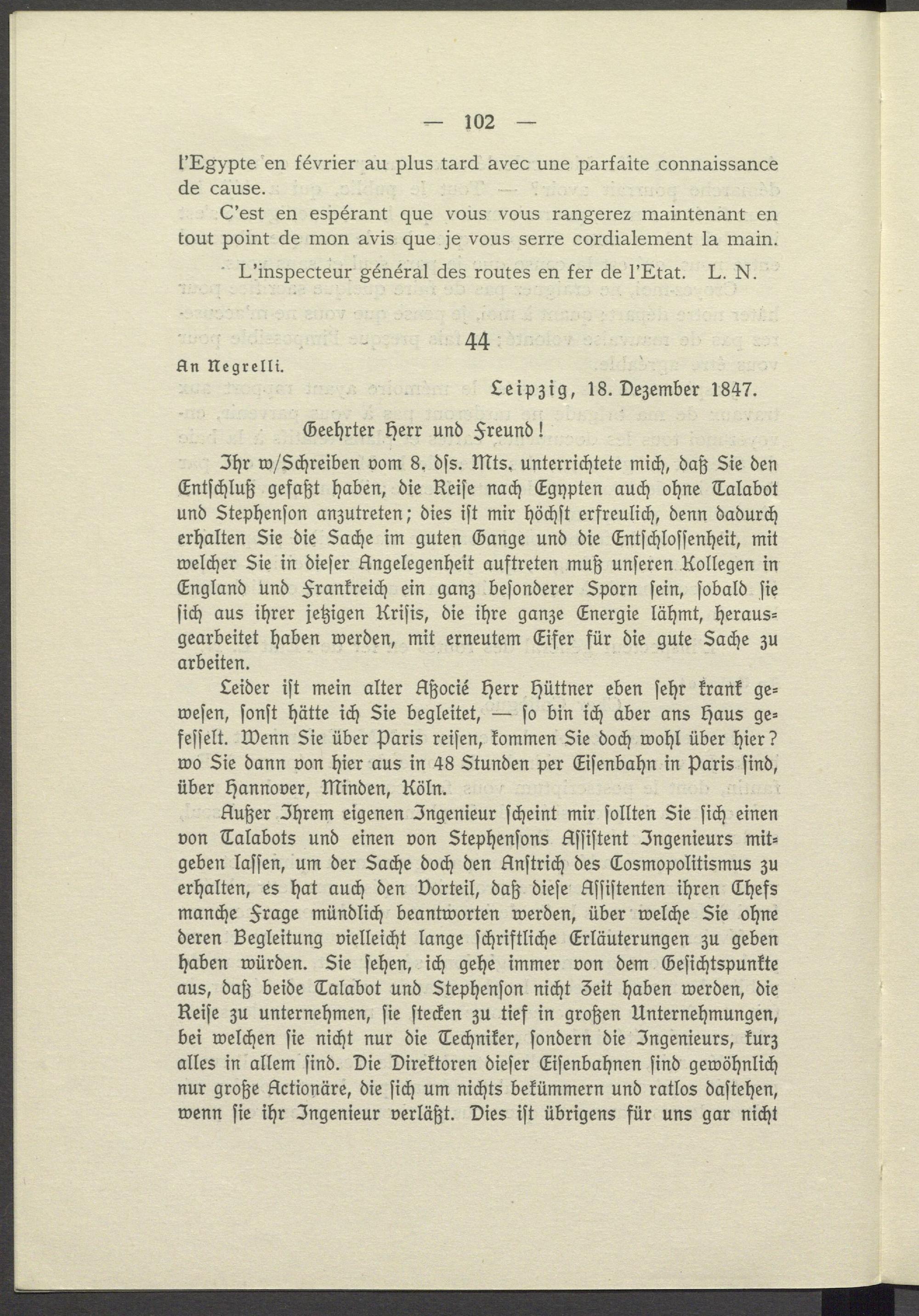 l'Egypte en février au plus tard avec une parfaite connaissance de cause. love sico obb C'est en espérant que vous vous rangerez maintenant en tout point de mon avis que je vous serre cordialement la main. L'inspecteur général des routes en fer de l'Etat. L. N.