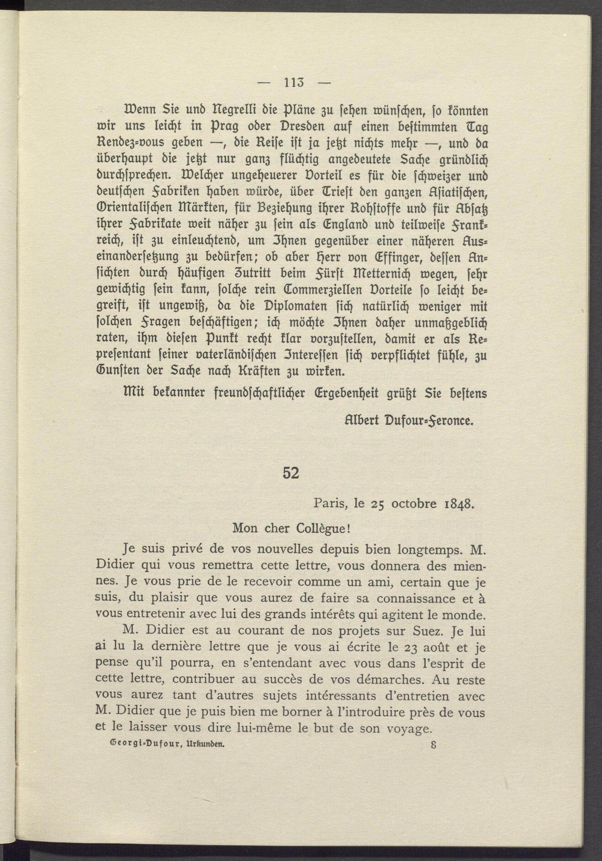 Wenn Sie und Negrelli die Pläne zu sehen wünschen, so könnten wir uns leicht in Prag oder Dresden auf einen bestimmten Tag Rendez- vous geben, die Reise ist ja jetzt nichts mehr-, und da überhaupt die jetzt nur ganz flüchtig angedeutete Sache gründlich durchsprechen. Welcher ungeheuerer Vorteil es für die schweizer und deutschen Fabriken haben würde, über Triest den ganzen Asiatischen, Orientalischen Märkten, für Beziehung ihrer Rohstoffe und für Absatz ihrer Fabrikate weit näher zu sein als England und teilweise Frankreich, ist zu einleuchtend, um Ihnen gegenüber einer näheren Aus= einandersetzung zu bedürfen; ob aber Herr von Effinger, dessen Ansichten durch häufigen Zutritt beim Fürst Metternich wegen, sehr gewichtig sein kann, solche rein Commerziellen Vorteile so leicht be= greift, ist ungewiß, da die Diplomaten sich natürlich weniger mit solchen Fragen beschäftigen; ich möchte Ihnen daher unmaßgeblich raten, ihm diesen Punkt recht klar vorzustellen, damit er als Representant seiner vaterländischen Interessen sich verpflichtet fühle, zu Gunsten der Sache nach Kräften zu wirken.