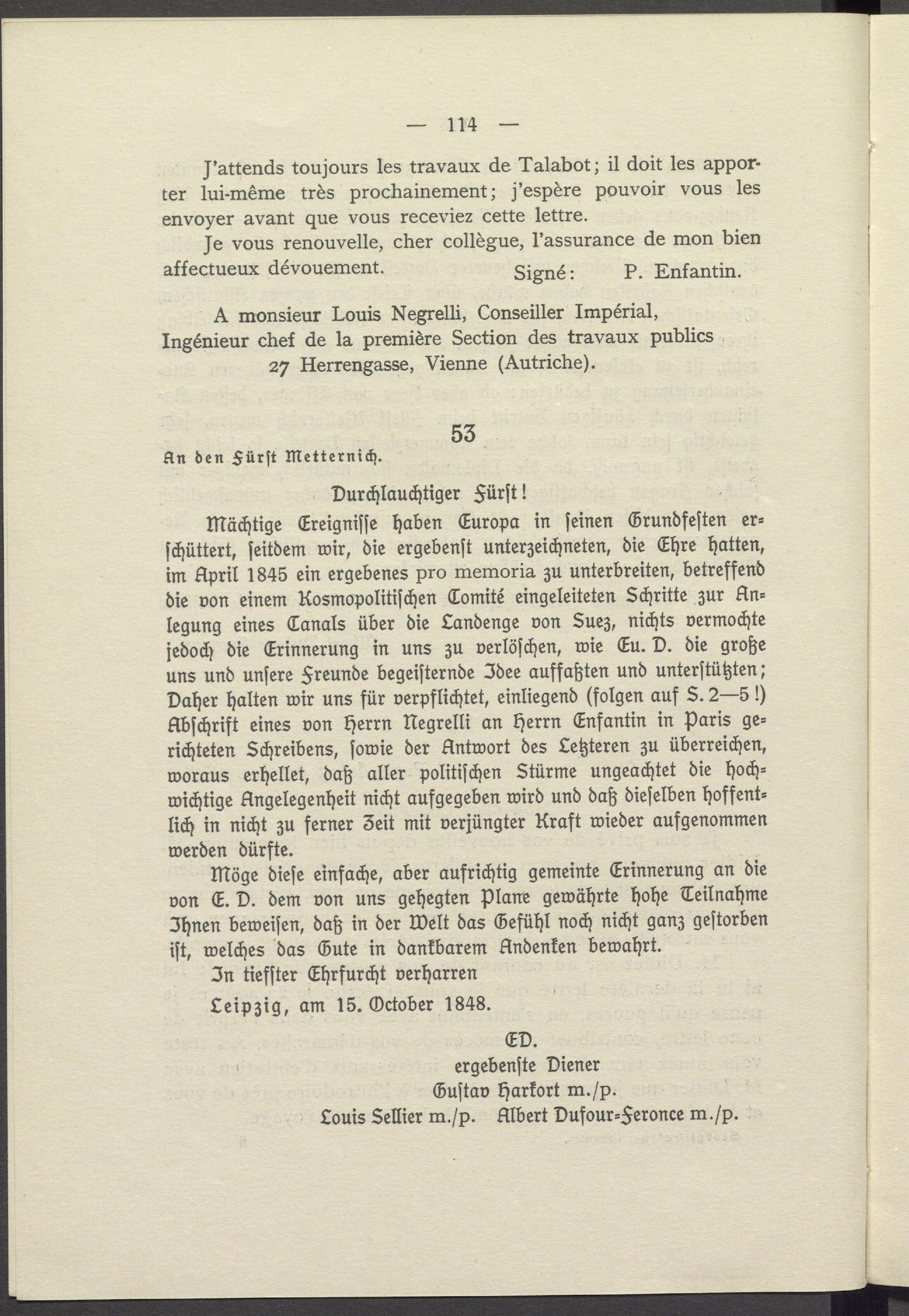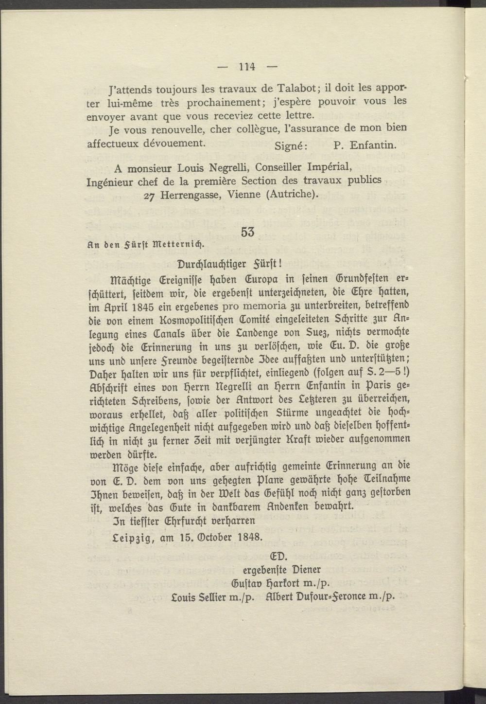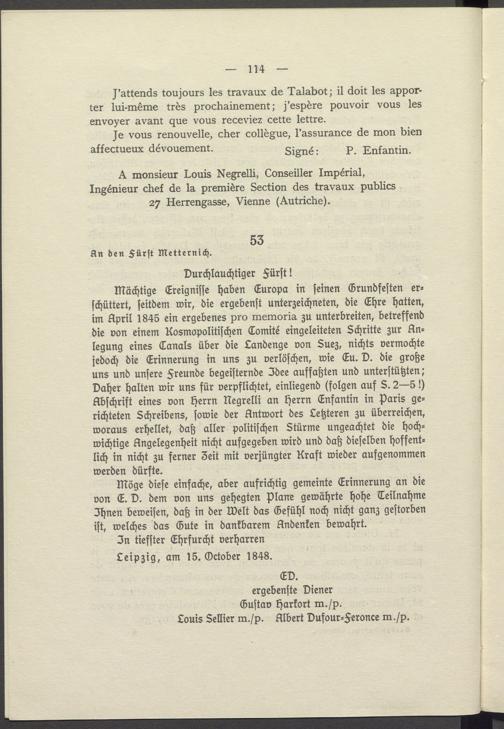Mächtige Ereignisse haben Europa in seinen Grundfesten erschüttert, seitdem wir, die ergebenst unterzeichneten, die Ehre hatten, im April 1845 ein ergebenes pro memoria zu unterbreiten, betreffend die von einem Kosmopolitischen Comité eingeleiteten Schritte zur An= legung eines Canals über die Landenge von Suez, nichts vermochte jedoch die Erinnerung in uns zu verlöschen, wie Eu. D. die große uns und unsere Freunde begeisternde Idee auffaßten und unterstützten; Daher halten wir uns für verpflichtet, einliegend( folgen auf S. 2-5!) Abschrift eines von Herrn Negrelli an Herrn Enfantin in Paris ge= richteten Schreibens, sowie der Antwort des Lehteren zu überreichen, woraus erhellet, daß aller politischen Stürme ungeachtet die hoch= wichtige Angelegenheit nicht aufgegeben wird und daß dieselben hoffent= lich in nicht zu ferner 3eit mit verjüngter Kraft wieder aufgenommen werden dürfte.