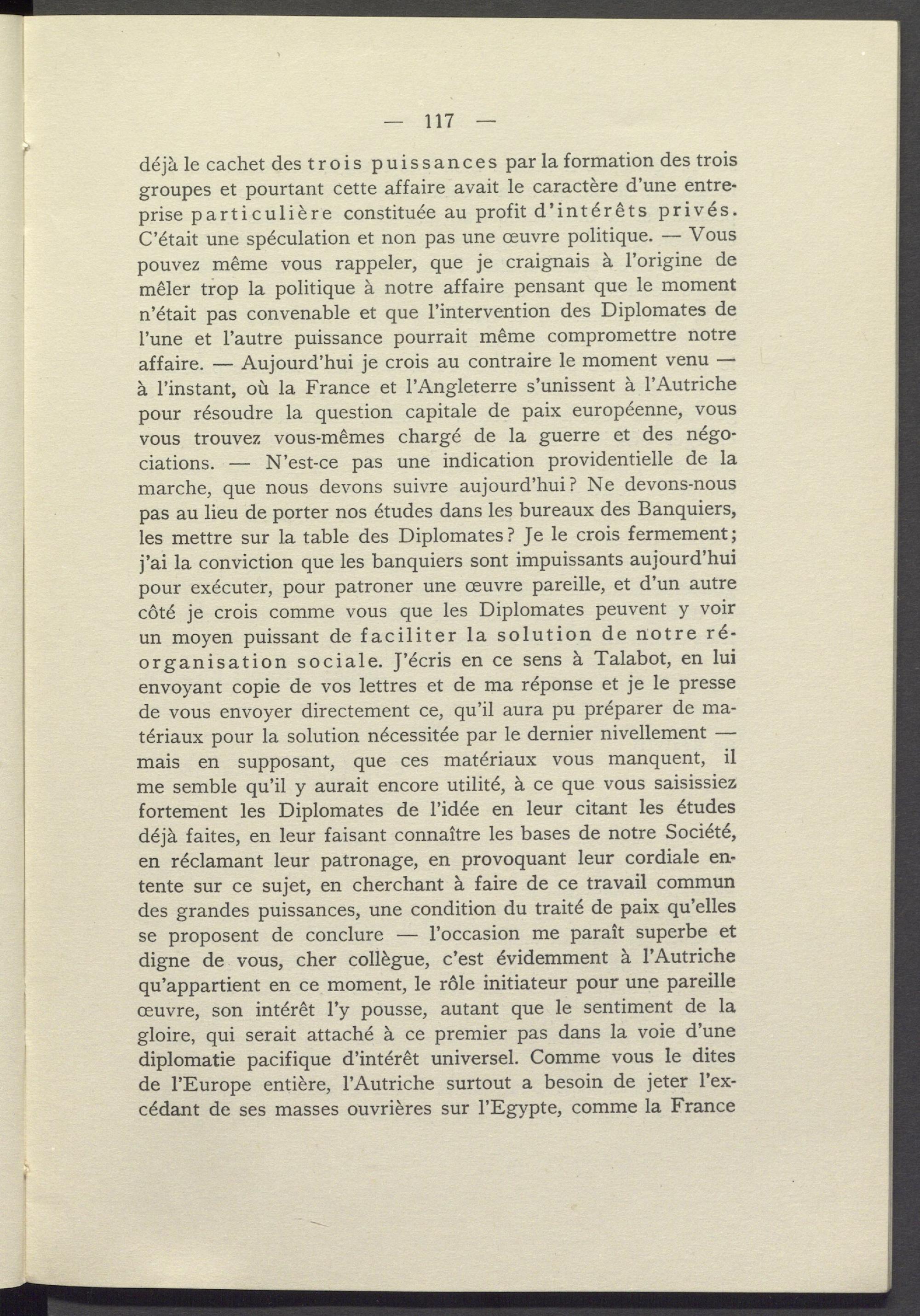 déjà le cachet des trois puissances par la formation des trois groupes et pourtant cette affaire avait le caractère d'une entreprise particulière constituée au profit d'intérêts privés. C'était une spéculation et non pas une œuvre politique. Vous pouvez même vous rappeler, que je craignais à l'origine de mêler trop la politique à notre affaire pensant que le moment n'était pas convenable et que l'intervention des Diplomates de l'une et l'autre puissance pourrait même compromettre notre affaire.- Aujourd'hui je crois au contraire le moment venu à l'instant, où la France et l'Angleterre s'unissent à l'Autriche pour résoudre la question capitale de paix européenne, vous vous trouvez vous- mêmes chargé de la guerre et des négociations.- N'est- ce pas une indication providentielle de la marche, que nous devons suivre aujourd'hui? Ne devons- nous pas au lieu de porter nos études dans les bureaux des Banquiers, les mettre sur la table des Diplomates? Je le crois fermement; j'ai la conviction que les banquiers sont impuissants aujourd'hui pour exécuter, pour patroner une œuvre pareille, et d'un autre côté je crois comme vous que les Diplomates peuvent y voir un moyen puissant de faciliter la solution de notre réorganisation sociale. J'écris en ce sens à Talabot, en lui envoyant copie de vos lettres et de ma réponse et je le presse de vous envoyer directement ce, qu'il aura pu préparer de matériaux pour la solution nécessitée par le dernier nivellement mais en supposant, que ces matériaux vous manquent, il me semble qu'il y aurait encore utilité, à ce que vous saisissiez fortement les Diplomates de l'idée en leur citant les études déjà faites, en leur faisant connaître les bases de notre Société, en réclamant leur patronage, en provoquant leur cordiale entente sur ce sujet, en cherchant à faire de ce travail commun des grandes puissances, une condition du traité de paix qu'elles se proposent de conclure l'occasion me paraît superbe et digne de vous, cher collègue, c'est évidemment à l'Autriche qu'appartient en ce moment, le rôle initiateur pour une pareille œuvre, son intérêt l'y pousse, autant que le sentiment de la gloire, qui serait attaché à ce premier pas dans la voie d'une diplomatie pacifique d'intérêt universel. Comme vous le dites de l'Europe entière, l'Autriche surtout a besoin de jeter l'excédant de ses masses ouvrières sur l'Egypte, comme la France