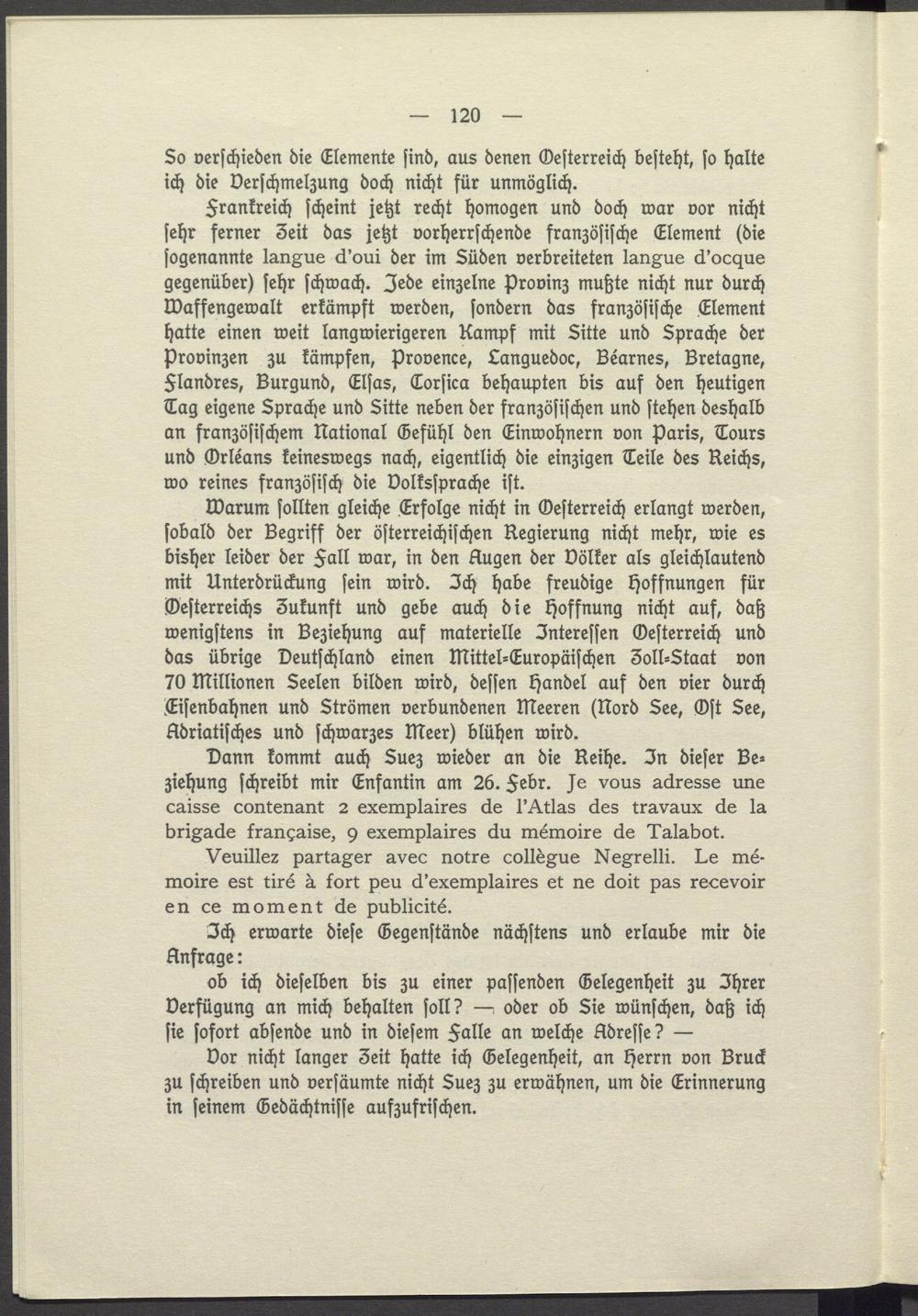 Dann kommt auch Suez wieder an die Reihe. In dieser Beziehung schreibt mir Enfantin am 26. Febr. Je vous adresse une caisse contenant 2 exemplaires de l'Atlas des travaux de la brigade française, 9 exemplaires du mémoire de Talabot.