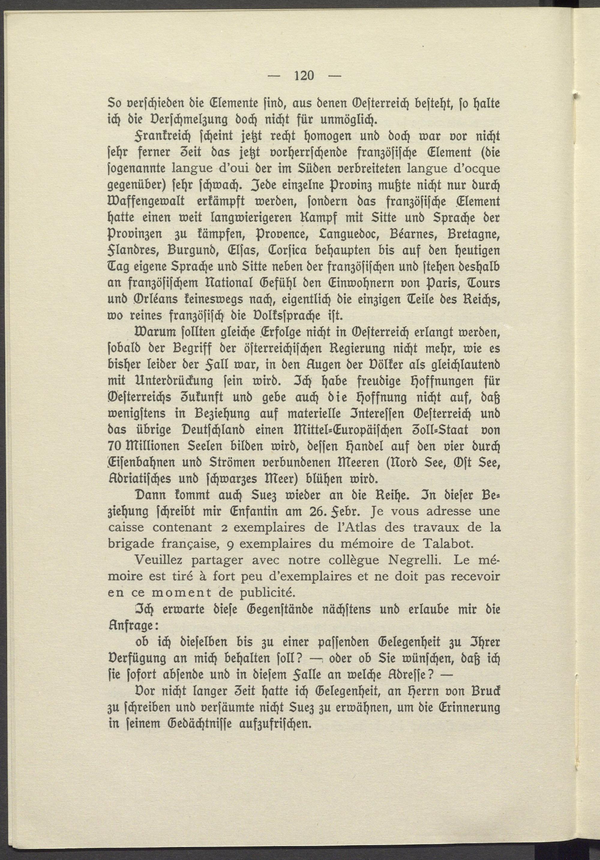 Warum sollten gleiche Erfolge nicht in Oesterreich erlangt werden, sobald der Begriff der österreichischen Regierung nicht mehr, wie es bisher leider der Fall war, in den Augen der Völker als gleichlautend mit Unterdrückung sein wird. Ich habe freudige Hoffnungen für Oesterreichs Zukunft und gebe auch die Hoffnung nicht auf, daß wenigstens in Beziehung auf materielle Interessen Oesterreich und das übrige Deutschland einen Mittel- Europäischen 3oll- Staat von 70 millionen Seelen bilden wird, dessen Handel auf den vier durch Eisenbahnen und Strömen verbundenen Meeren( Nord See, Ost See, Adriatisches und schwarzes Meer) blühen wird.
