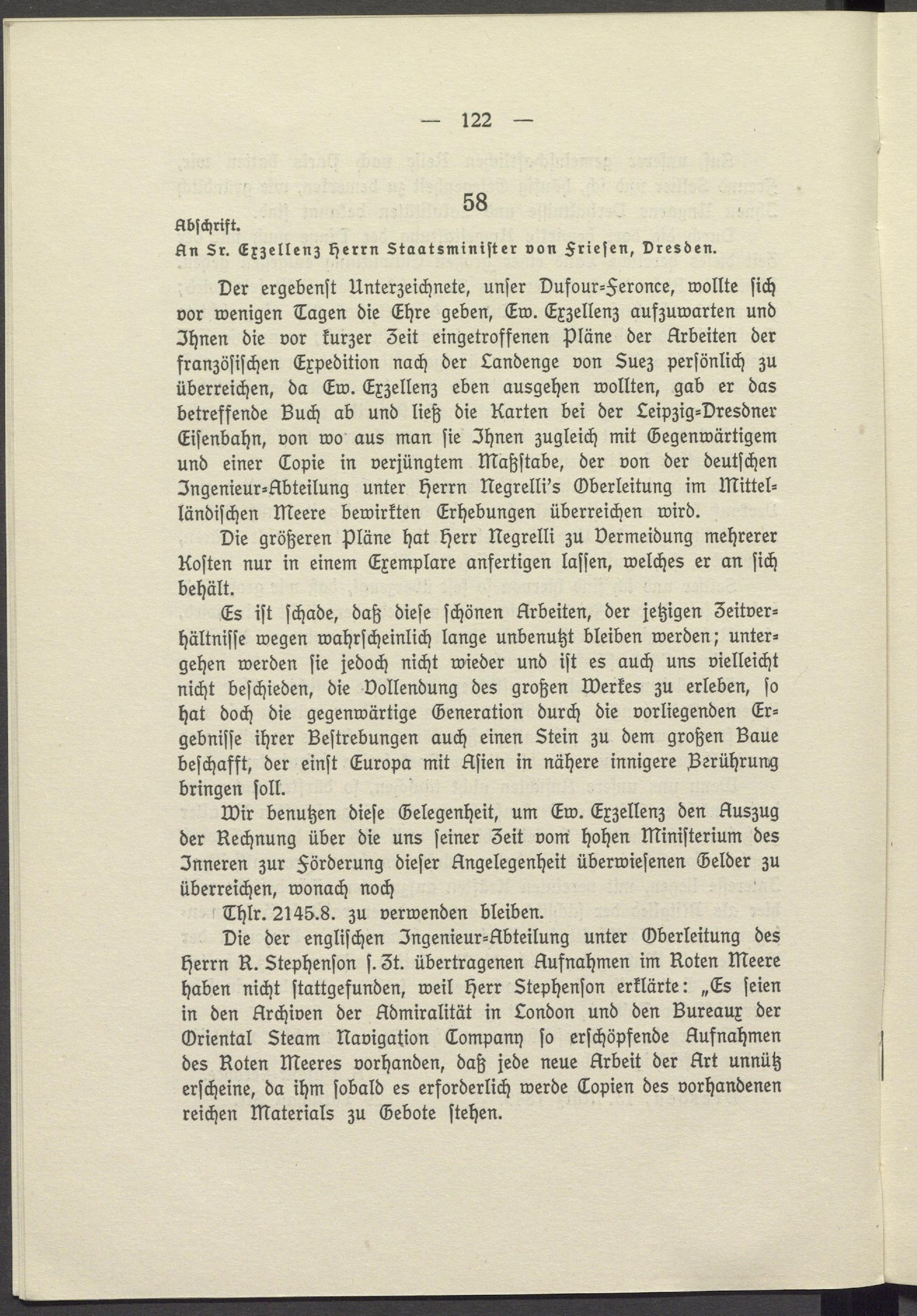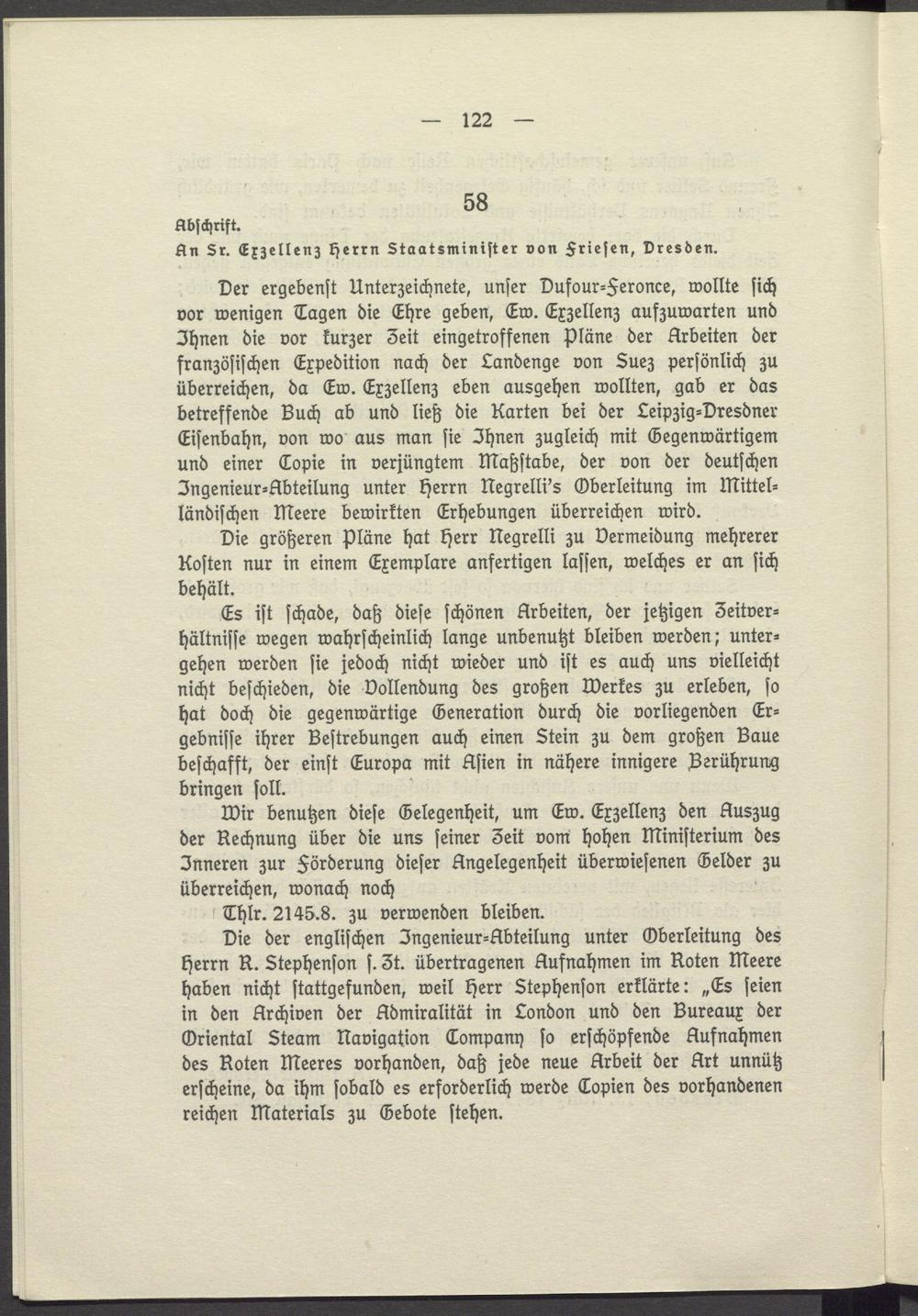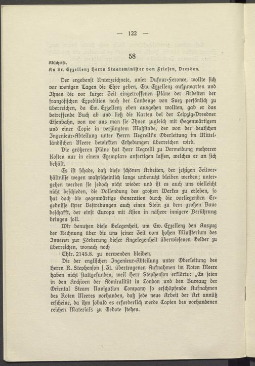 Der ergebenst Unterzeichnete, unser Dufour- Feronce, wollte sich vor wenigen Tagen die Ehre geben, Ew. Exzellenz aufzuwarten und Ihnen die vor kurzer Zeit eingetroffenen Pläne der Arbeiten der französischen Expedition nach der Landenge von Suez persönlich zu überreichen, da Ew. Erzellenz eben ausgehen wollten, gab er das betreffende Buch ab und ließ die Karten bei der Leipzig- Dresdner Eisenbahn, von wo aus man sie Ihnen zugleich mit Gegenwärtigem und einer Copie in verjüngtem Maßstabe, der von der deutschen Ingenieur- Abteilung unter Herrn Negrelli's Oberleitung im Mittelländischen Meere bewirkten Erhebungen überreichen wird.