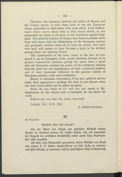Aus der Ihnen von Leipzig aus gesandten Abschrift meines Briefes an Starbuck werden Sie ersehen haben, daß wir ungeachtet der Ungunst der politischen Verhältnisse unsere große Suez Angelegen= heit nicht vergessen.