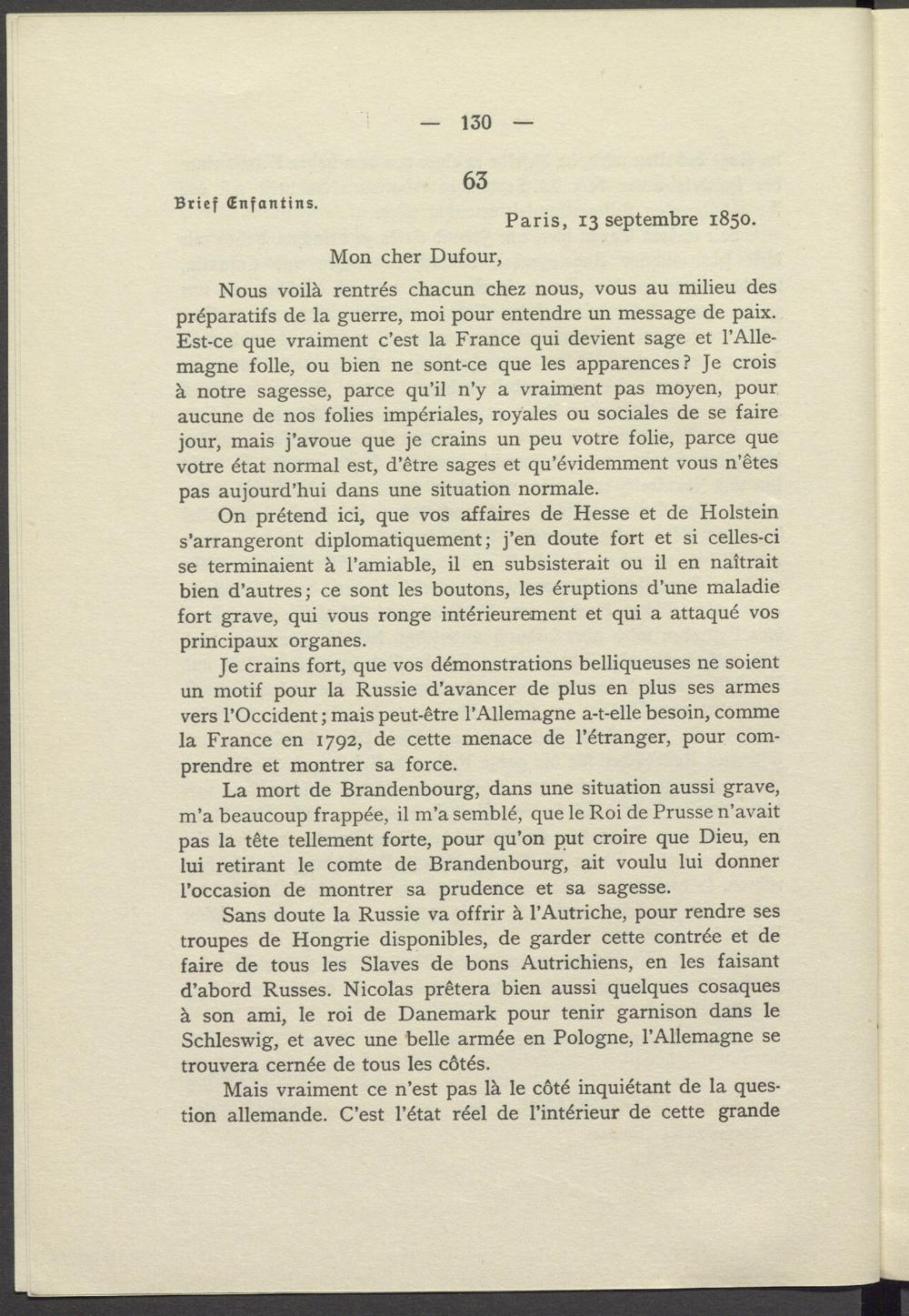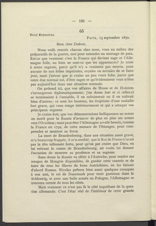 Nous voilà rentrés chacun chez nous, vous au milieu des préparatifs de la guerre, moi pour entendre un message de paix. Est- ce que vraiment c'est la France qui devient sage et l'Allemagne folle, ou bien ne sont- ce que les apparences? Je crois à notre sagesse, parce qu'il n'y a vraiment pas moyen, pour aucune de nos folies impériales, royales ou sociales de se faire jour, mais j'avoue que je crains un peu votre folie, parce que votre état normal est, d'être sages et qu'évidemment vous n'êtes pas aujourd'hui dans une situation normale.
