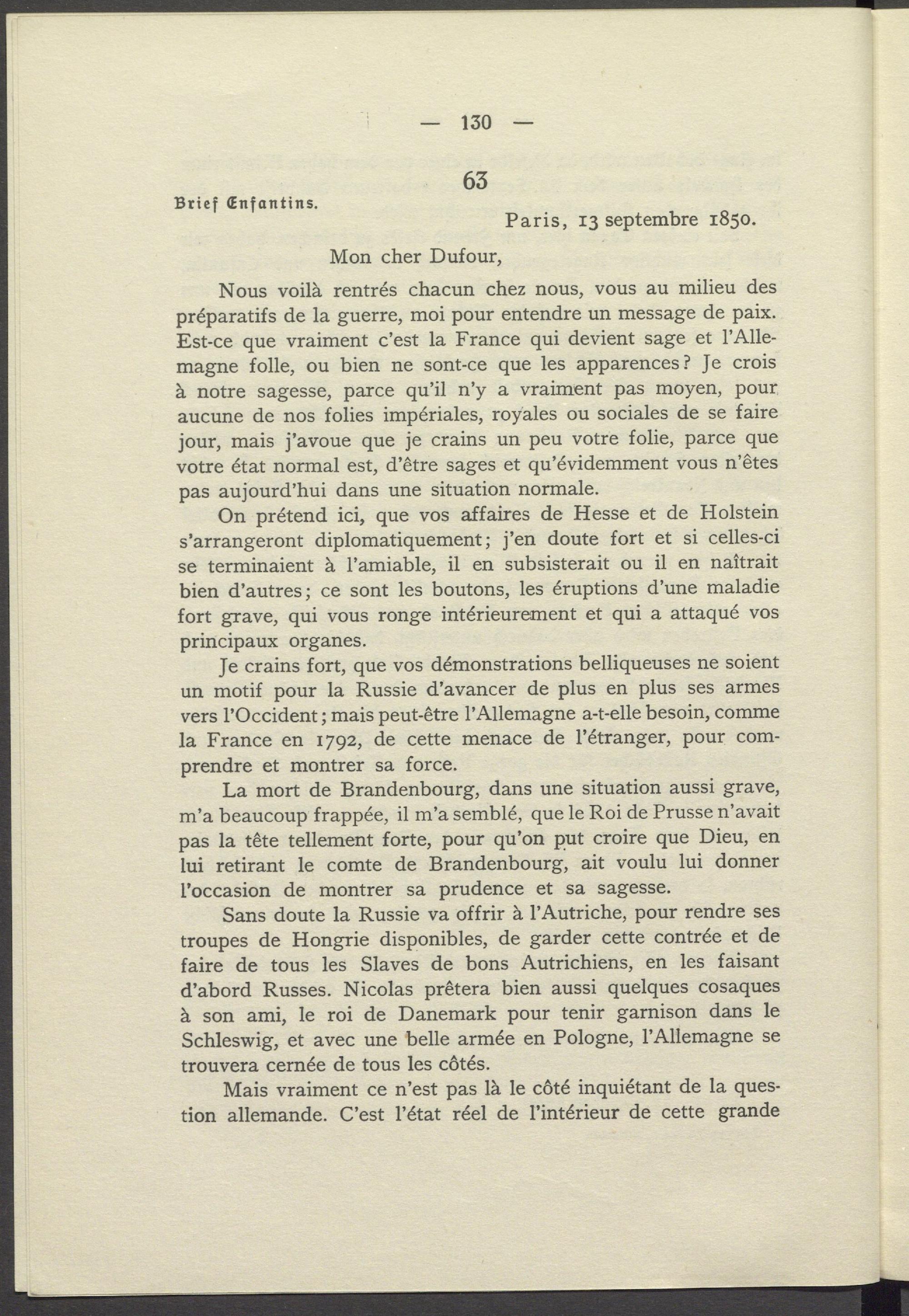 Je crains fort, que vos démonstrations belliqueuses ne soient un motif pour la Russie d'avancer de plus en plus ses armes vers l'Occident; mais peut- être l'Allemagne a- t- elle besoin, comme la France en 1792, de cette menace de l'étranger, pour comprendre et montrer sa force.