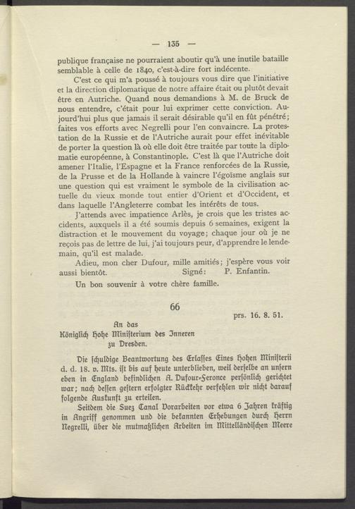 Adieu, mon cher Dufour, mille amitiés; j'espère vous voir aussi bientôt. Signé: P. Enfantin.