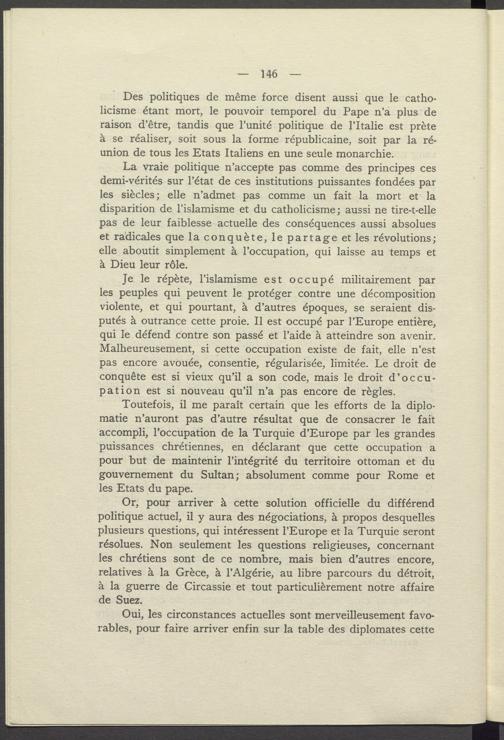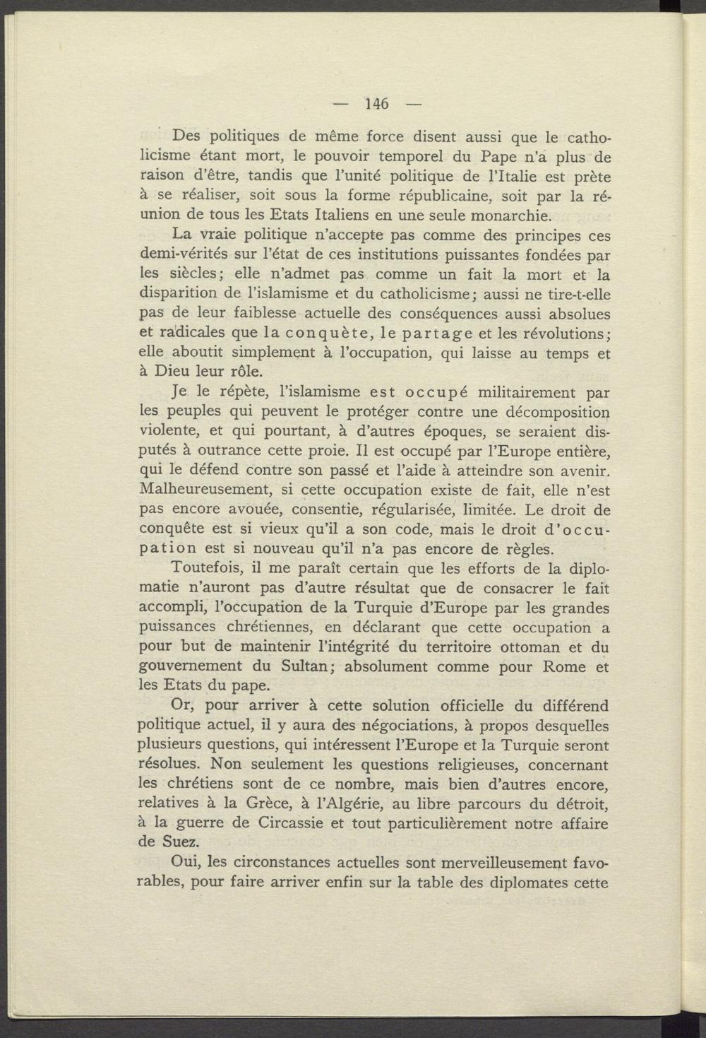 La vraie politique n'accepte pas comme des principes ces demi- vérités sur l'état de ces institutions puissantes fondées par les siècles; elle n'admet pas comme un fait la mort et la disparition de l'islamisme et du catholicisme; aussi ne tire- t- elle pas de leur faiblesse actuelle des conséquences aussi absolues et radicales que la conquète, le partage et les révolutions; elle aboutit simplement à l'occupation, qui laisse au temps et à Dieu leur rôle.