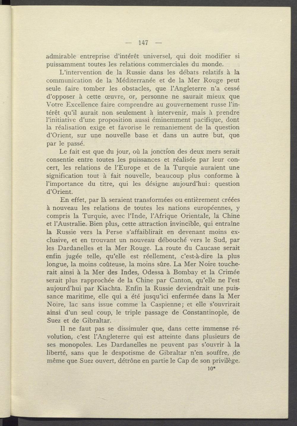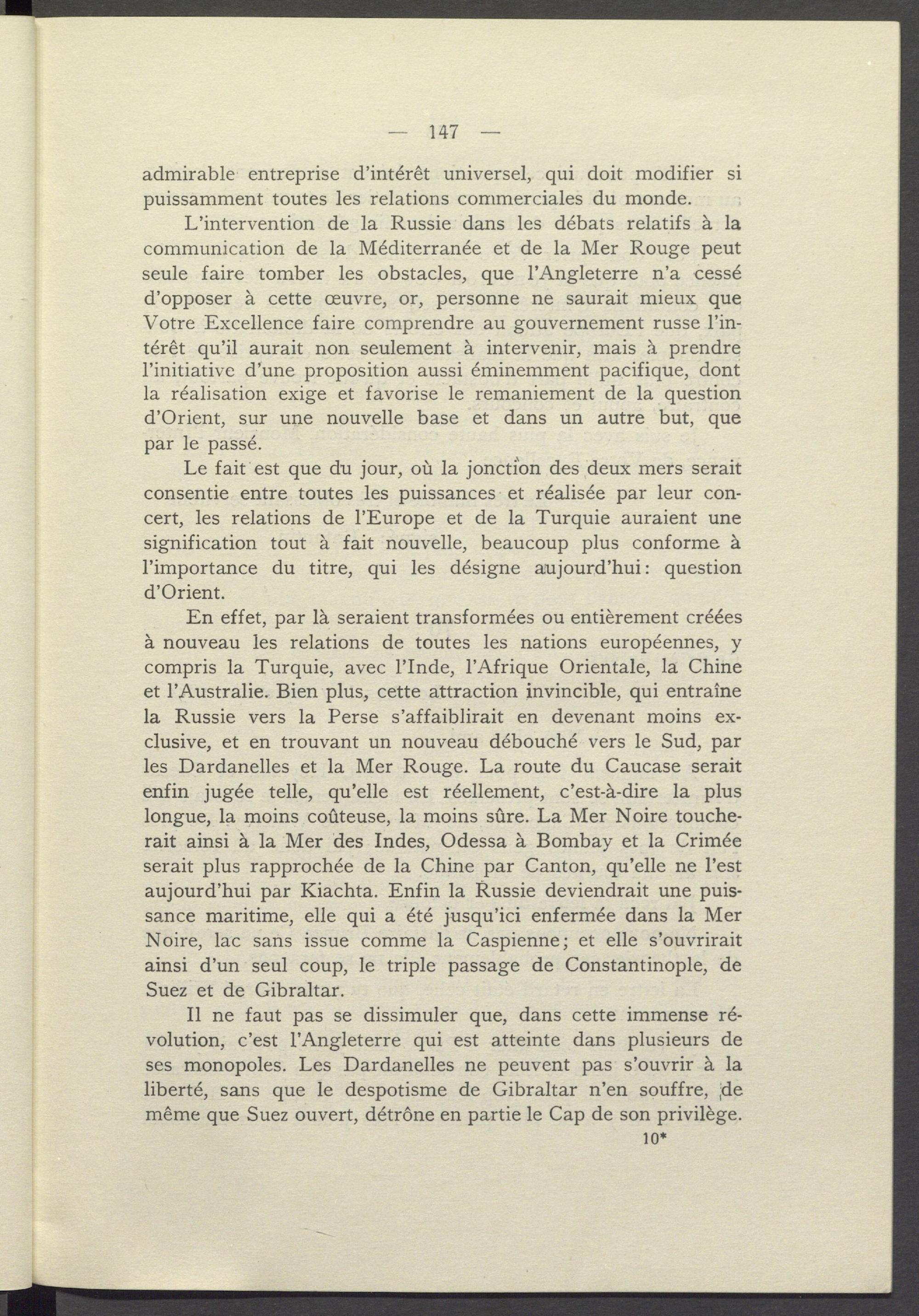 L'intervention de la Russie dans les débats relatifs à la communication de la Méditerranée et de la Mer Rouge peut seule faire tomber les obstacles, que l'Angleterre n'a cessé d'opposer à cette œuvre, or, personne ne saurait mieux que Votre Excellence faire comprendre au gouvernement russe l'intérêt qu'il aurait non seulement à intervenir, mais à prendre l'initiative d'une proposition aussi éminemment pacifique, dont la réalisation exige et favorise le remaniement de la question d'Orient, sur une nouvelle base et dans un autre but, que par le passé.