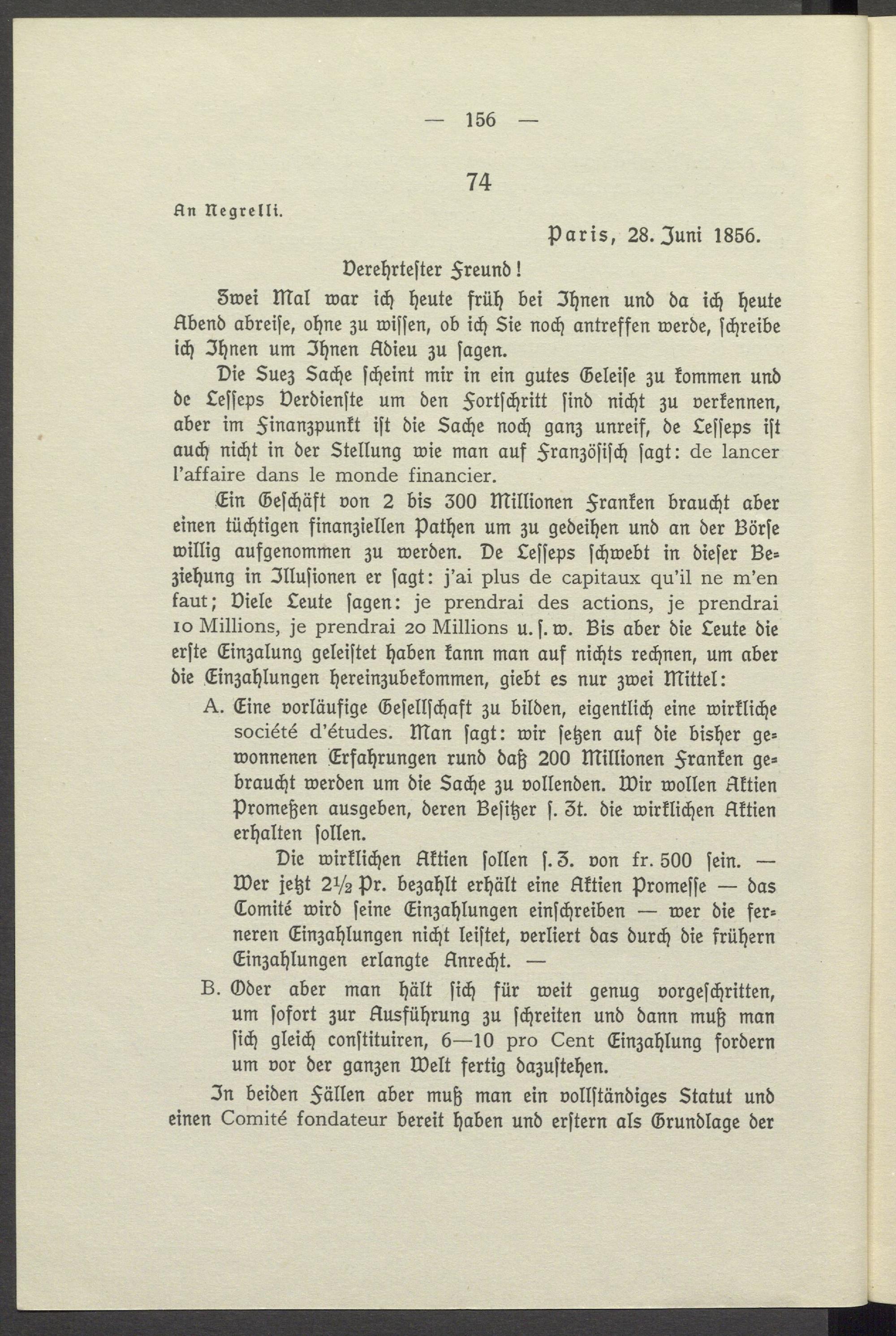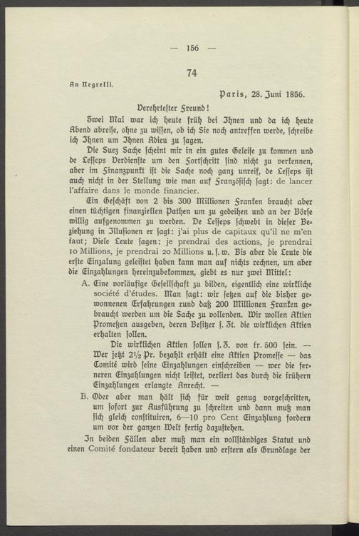 Die Suez Sache scheint mir in ein gutes Geleise zu kommen und de Lesseps Verdienste um den Fortschritt sind nicht zu verkennen, aber im Finanzpunkt ist die Sache noch ganz unreif, de Lesseps ist auch nicht in der Stellung wie man auf Französisch sagt: de lancer l'affaire dans le monde financier.