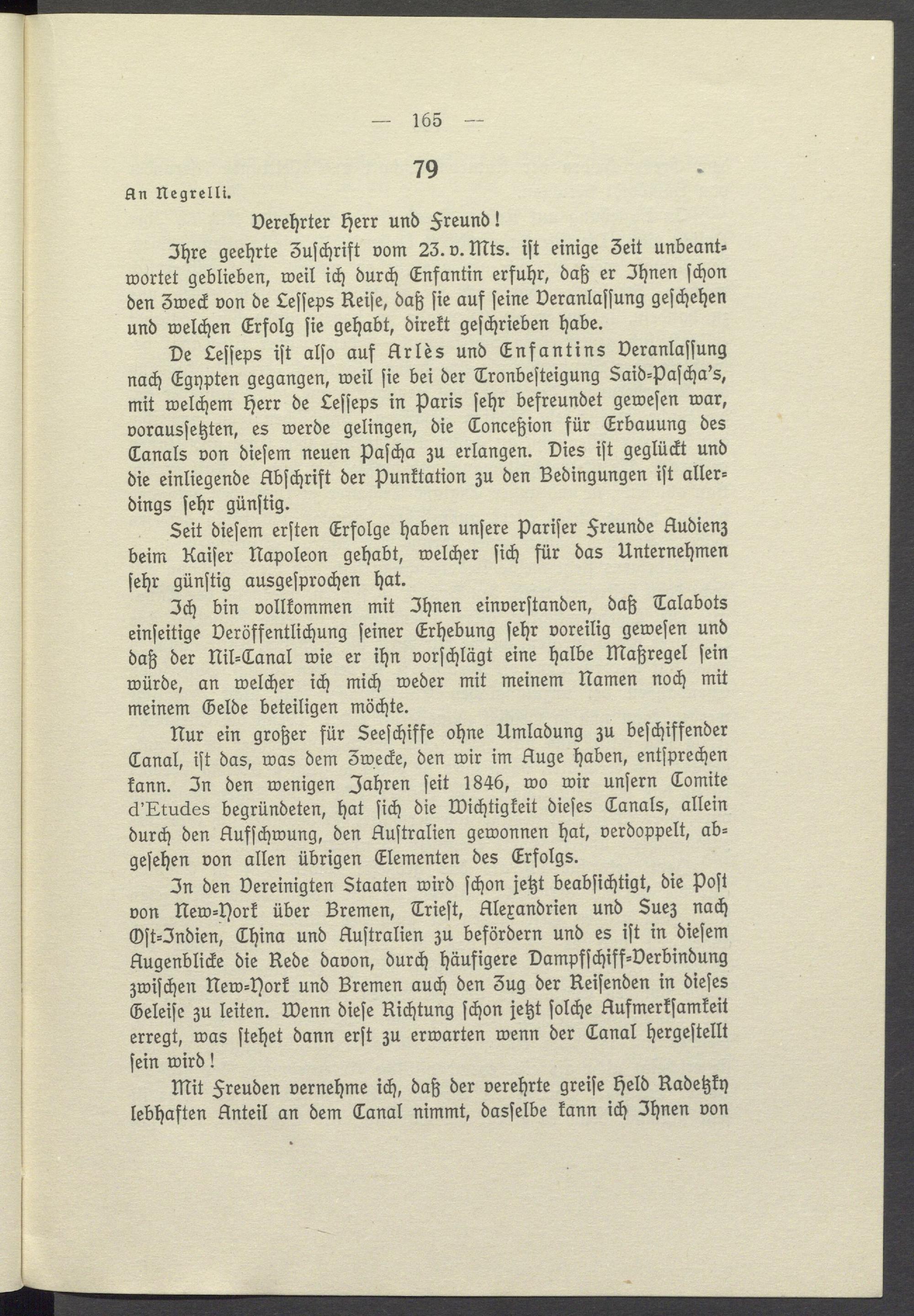 De Lesseps ist also auf Arlès und Enfantins Veranlassung nach Egypten gegangen, weil sie bei der Tronbesteigung Said- Pascha's, mit welchem Herr de Lesseps in Paris sehr befreundet gewesen war, voraussetzten, es werde gelingen, die Conceßion für Erbauung des Canals von diesem neuen Pascha zu erlangen. Dies ist geglückt und die einliegende Abschrift der Punktation zu den Bedingungen ist allerdings sehr günstig.