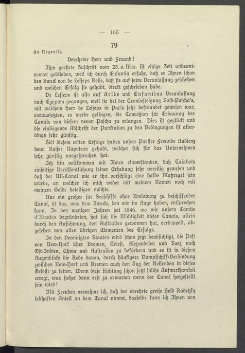 Ich bin vollkommen mit Ihnen einverstanden, daß Talabots einseitige Veröffentlichung seiner Erhebung sehr voreilig gewesen und daß der Nil- Canal wie er ihn vorschlägt eine halbe Maßregel sein würde, an welcher ich mich weder mit meinem Namen noch mit meinem Gelde beteiligen möchte.