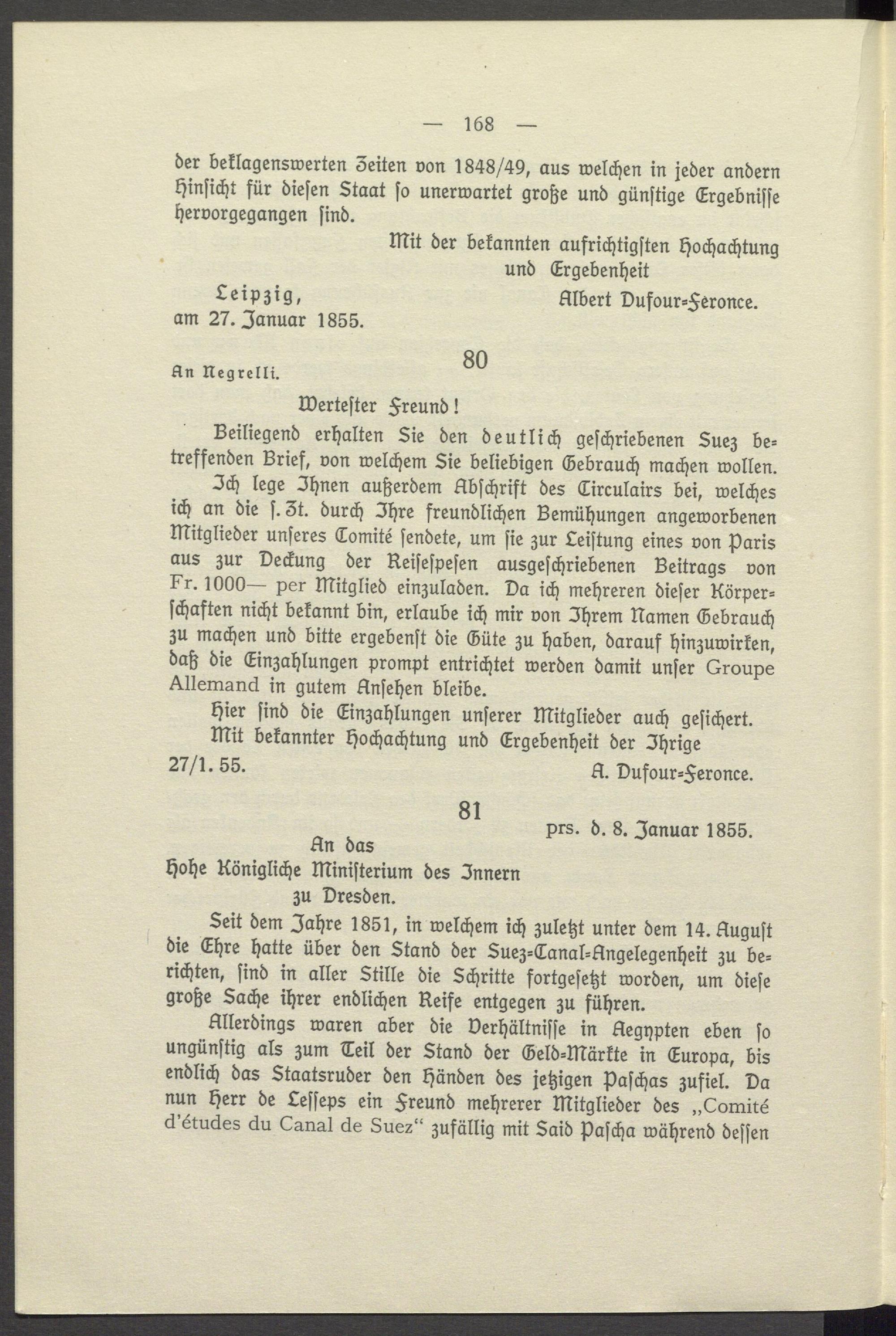 Seit dem Jahre 1851, in welchem ich zuletzt unter dem 14. August die Ehre hatte über den Stand der Suez- Canal- Angelegenheit zu be= richten, sind in aller Stille die Schritte fortgesetzt worden, um diese große Sache ihrer endlichen Reife entgegen zu führen.