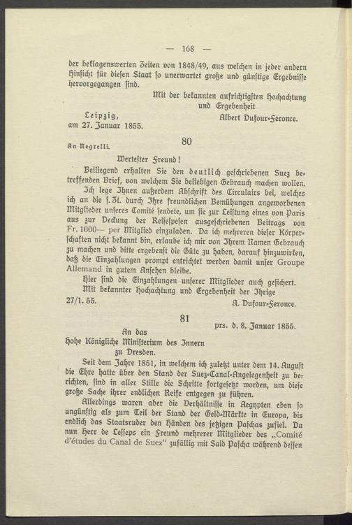 Ich lege Ihnen außerdem Abschrift des Circulairs bei, welches ich an die s. 3t. durch Ihre freundlichen Bemühungen angeworbenen Mitglieder unseres Comité sendete, um sie zur Leistung eines von Paris aus zur Deckung der Reisespesen ausgeschriebenen Beitrags von Fr. 1000 per Mitglied einzuladen. Da ich mehreren dieser Körperschaften nicht bekannt bin, erlaube ich mir von Ihrem Namen Gebrauch zu machen und bitte ergebenst die Güte zu haben, darauf hinzuwirken, daß die Einzahlungen prompt entrichtet werden damit unser Groupe Allemand in gutem Ansehen bleibe.