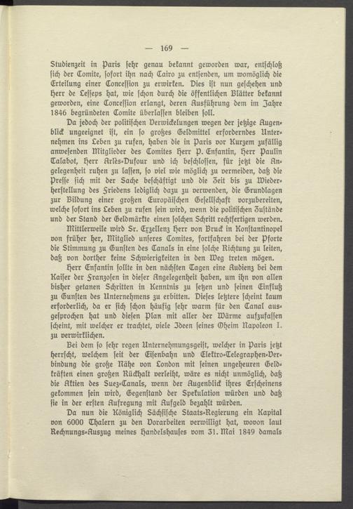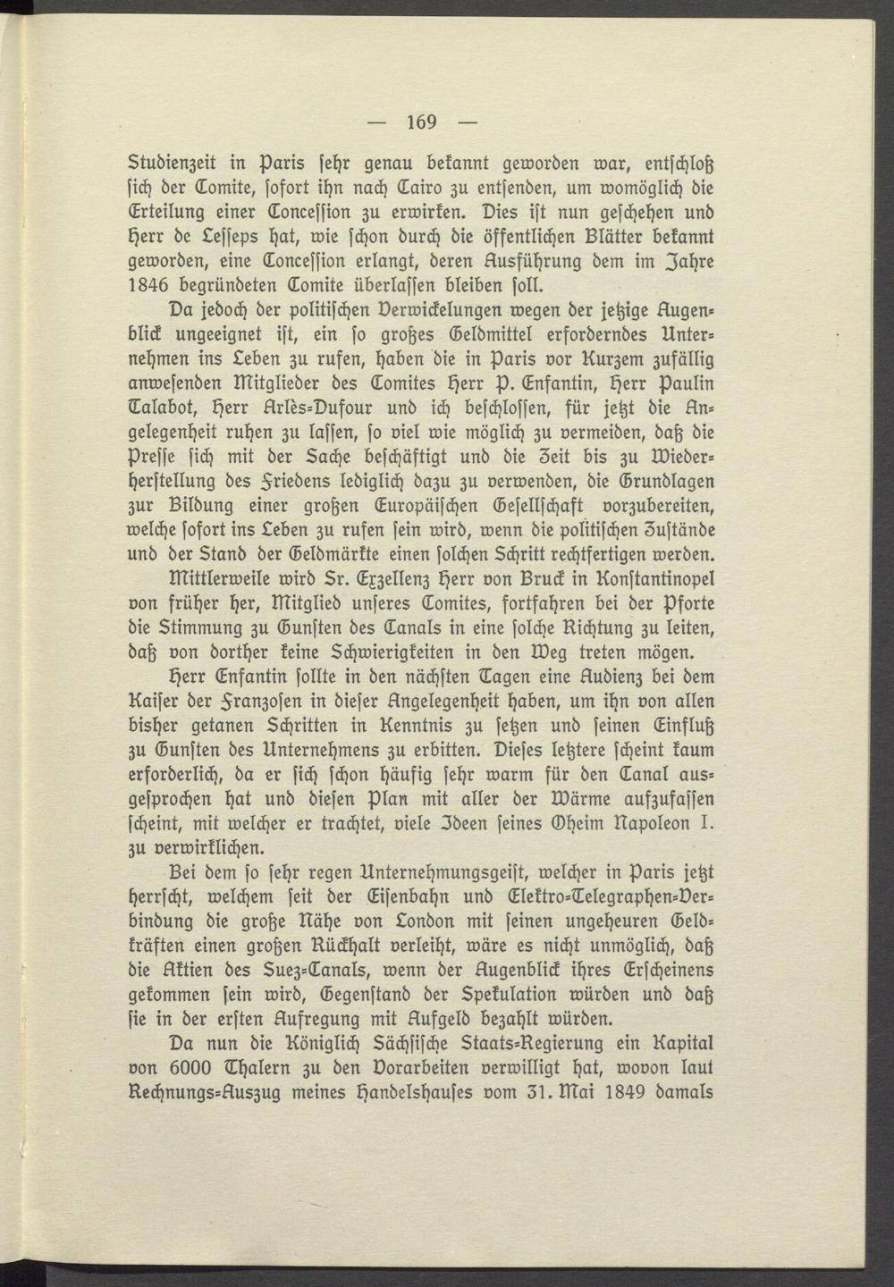 Herr Enfantin sollte in den nächsten Tagen eine Audienz bei dem Kaiser der Franzosen in dieser Angelegenheit haben, um ihn von allen bisher getanen Schritten in Kenntnis zu setzen und seinen Einfluß zu Gunsten des Unternehmens zu erbitten. Dieses letztere scheint kaum erforderlich, da er sich schon häufig sehr warm für den Tanal ausgesprochen hat und diesen Plan mit aller der Wärme aufzufassen scheint, mit welcher er trachtet, viele Ideen seines Oheim Napoleon I. zu verwirklichen.