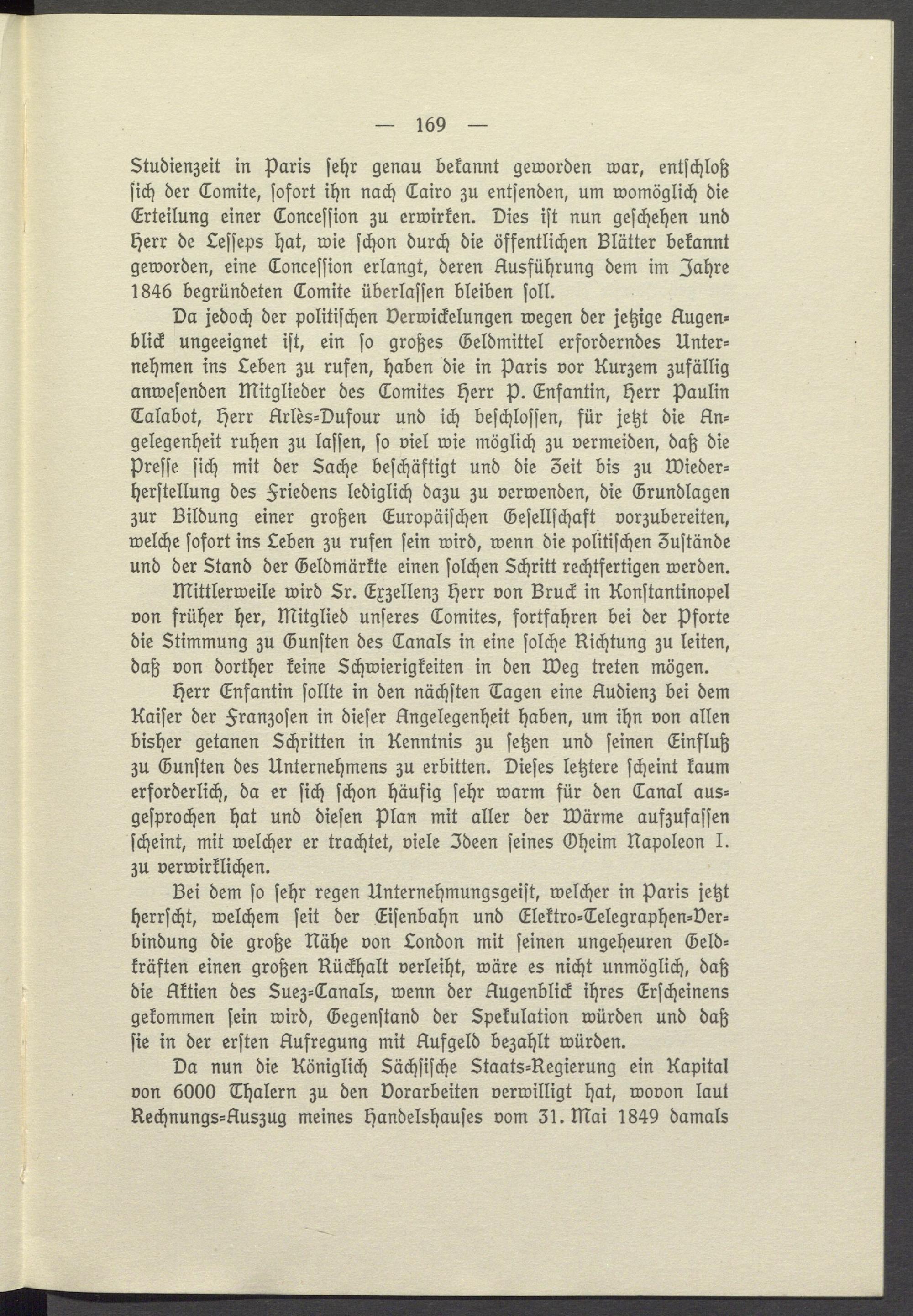 Studienzeit in Paris sehr genau bekannt geworden war, entschloß sich der Comite, sofort ihn nach Cairo zu entsenden, um womöglich die Erteilung einer Concession zu erwirken. Dies ist nun geschehen und Herr de Lesseps hat, wie schon durch die öffentlichen Blätter bekannt geworden, eine Concession erlangt, deren Ausführung dem im Jahre 1846 begründeten Comite überlassen bleiben soll.