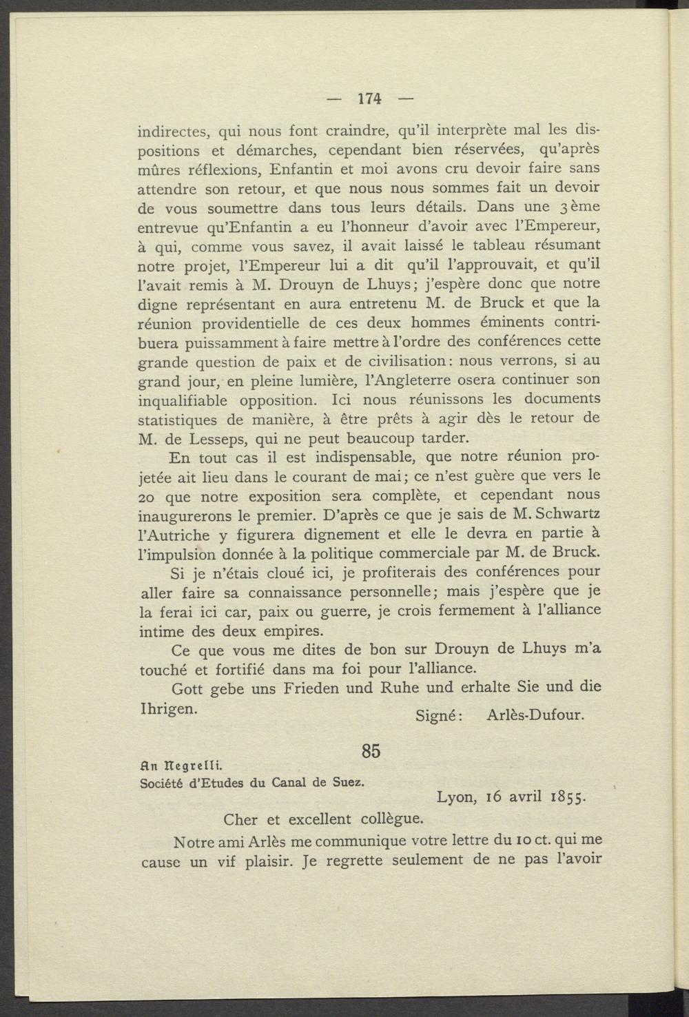 indirectes, qui nous font craindre, qu'il interprète mal les dispositions et démarches, cependant bien réservées, qu'après mûres réflexions, Enfantin et moi avons cru devoir faire sans attendre son retour, et que nous nous sommes fait un devoir de vous soumettre dans tous leurs détails. Dans une 3 ème entrevue qu'Enfantin a eu l'honneur d'avoir avec l'Empereur, à qui, comme vous savez, il avait laissé le tableau résumant notre projet, l'Empereur lui a dit qu'il l'approuvait, et qu'il l'avait remis à M. Drouyn de Lhuys; j'espère donc que notre digne représentant en aura entretenu M. de Bruck et que la réunion providentielle de ces deux hommes éminents contribuera puissamment à faire mettre à l'ordre des conférences cette grande question de paix et de civilisation: nous verrons, si au grand jour, en pleine lumière, l'Angleterre osera continuer son inqualifiable opposition. Ici nous réunissons les documents statistiques de manière, à être prêts à agir dès le retour de M. de Lesseps, qui ne peut beaucoup tarder.