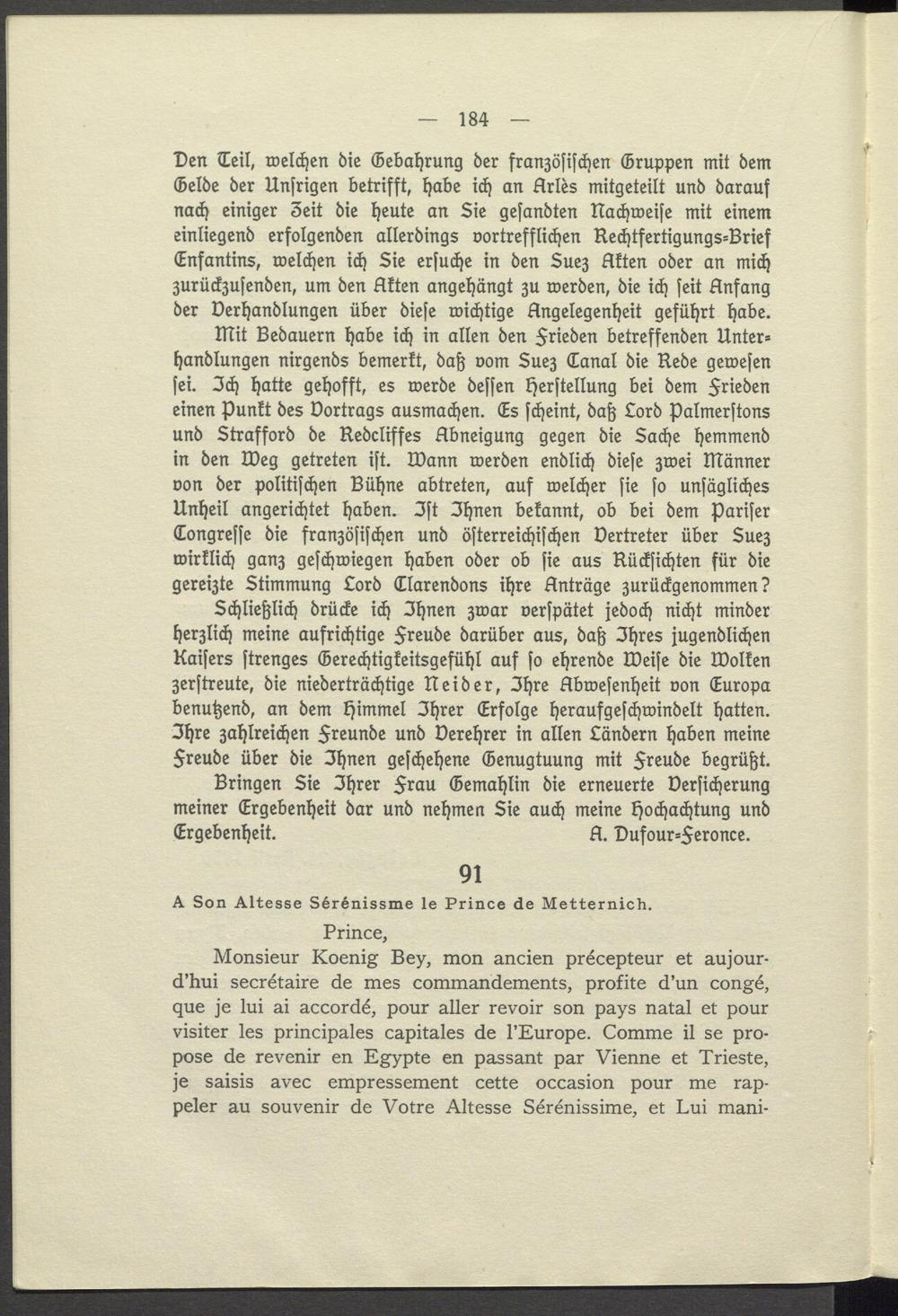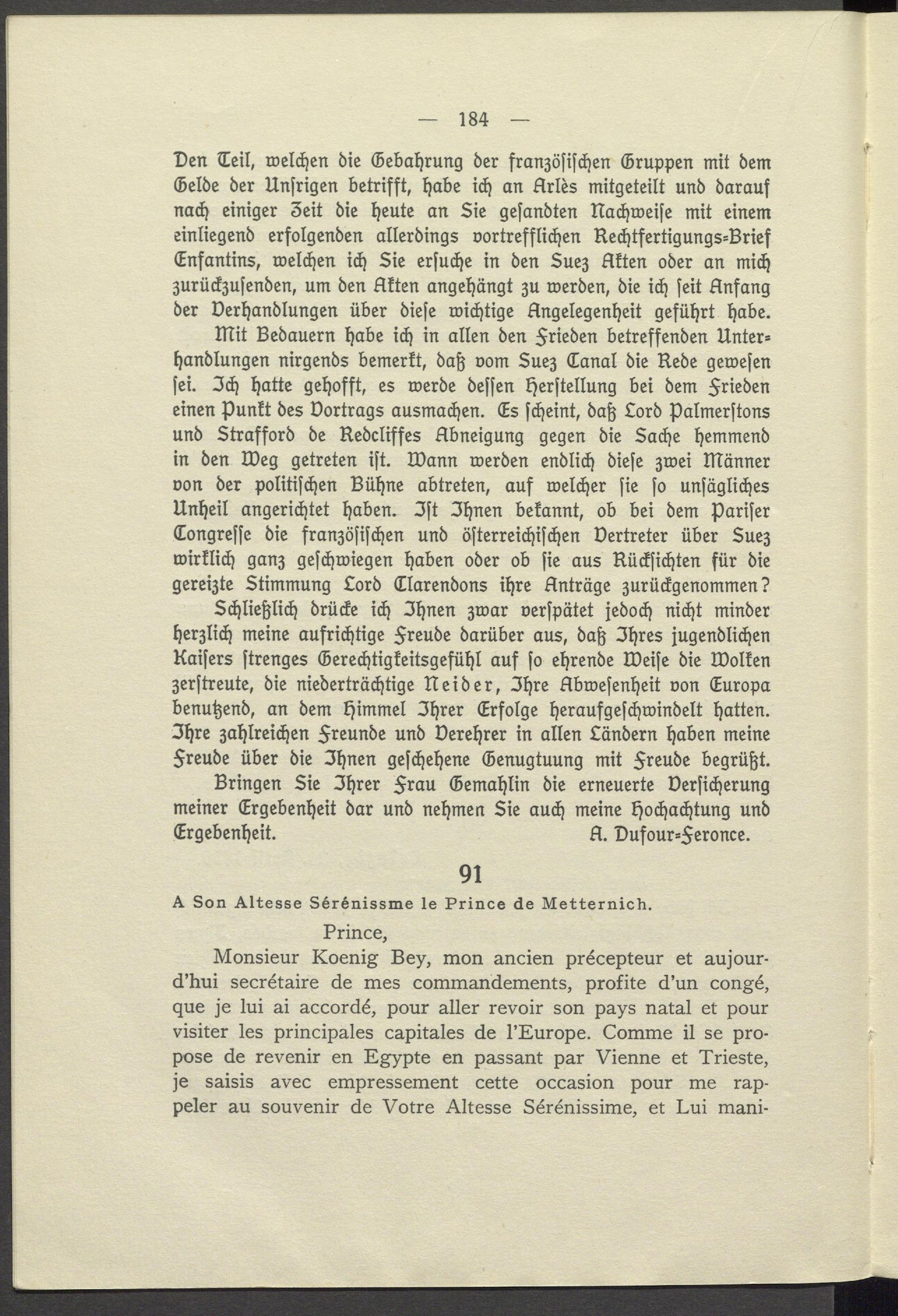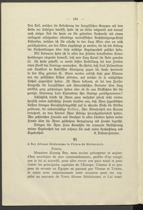 Den Teil, welchen die Gebahrung der französischen Gruppen mit dem Gelde der Unsrigen betrifft, habe ich an Arlès mitgeteilt und darauf nach einiger Zeit die heute an Sie gesandten Nachweise mit einem einliegend erfolgenden allerdings vortrefflichen Rechtfertigungs- Brief Enfantins, welchen ich Sie ersuche in den Suez Akten oder an mich zurückzusenden, um den Akten angehängt zu werden, die ich seit Anfang der Verhandlungen über diese wichtige Angelegenheit geführt habe. Mit Bedauern habe ich in allen den Frieden betreffenden Unterhandlungen nirgends bemerkt, daß vom Suez Canal die Rede gewesen sei. Ich hatte gehofft, es werde dessen Herstellung bei dem Frieden einen Punkt des Vortrags ausmachen. Es scheint, daß Lord Palmerstons und Strafford de Redcliffes Abneigung gegen die Sache hemmend in den Weg getreten ist. Wann werden endlich diese zwei Männer von der politischen Bühne abtreten, auf welcher sie so unsägliches Unheil angerichtet haben. Ist Ihnen bekannt, ob bei dem Pariser Congresse die französischen und österreichischen Vertreter über Suez wirklich ganz geschwiegen haben oder ob sie aus Rücksichten für die gereizte Stimmung Lord Clarendons ihre Anträge zurückgenommen?