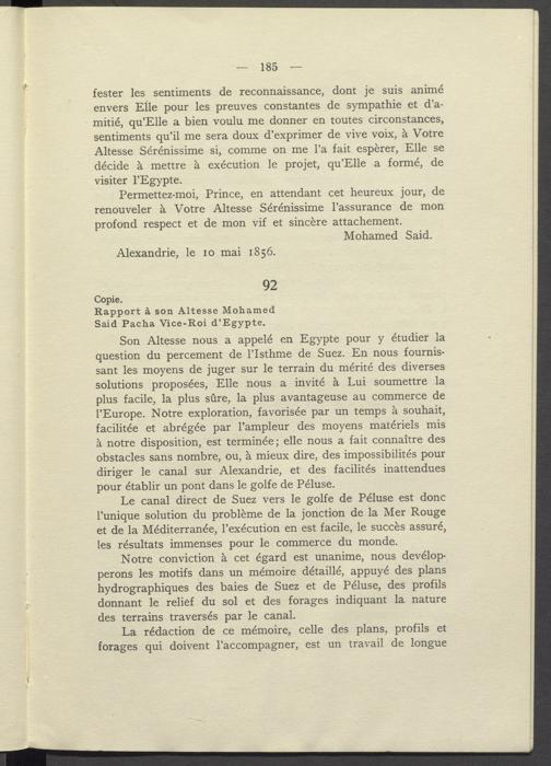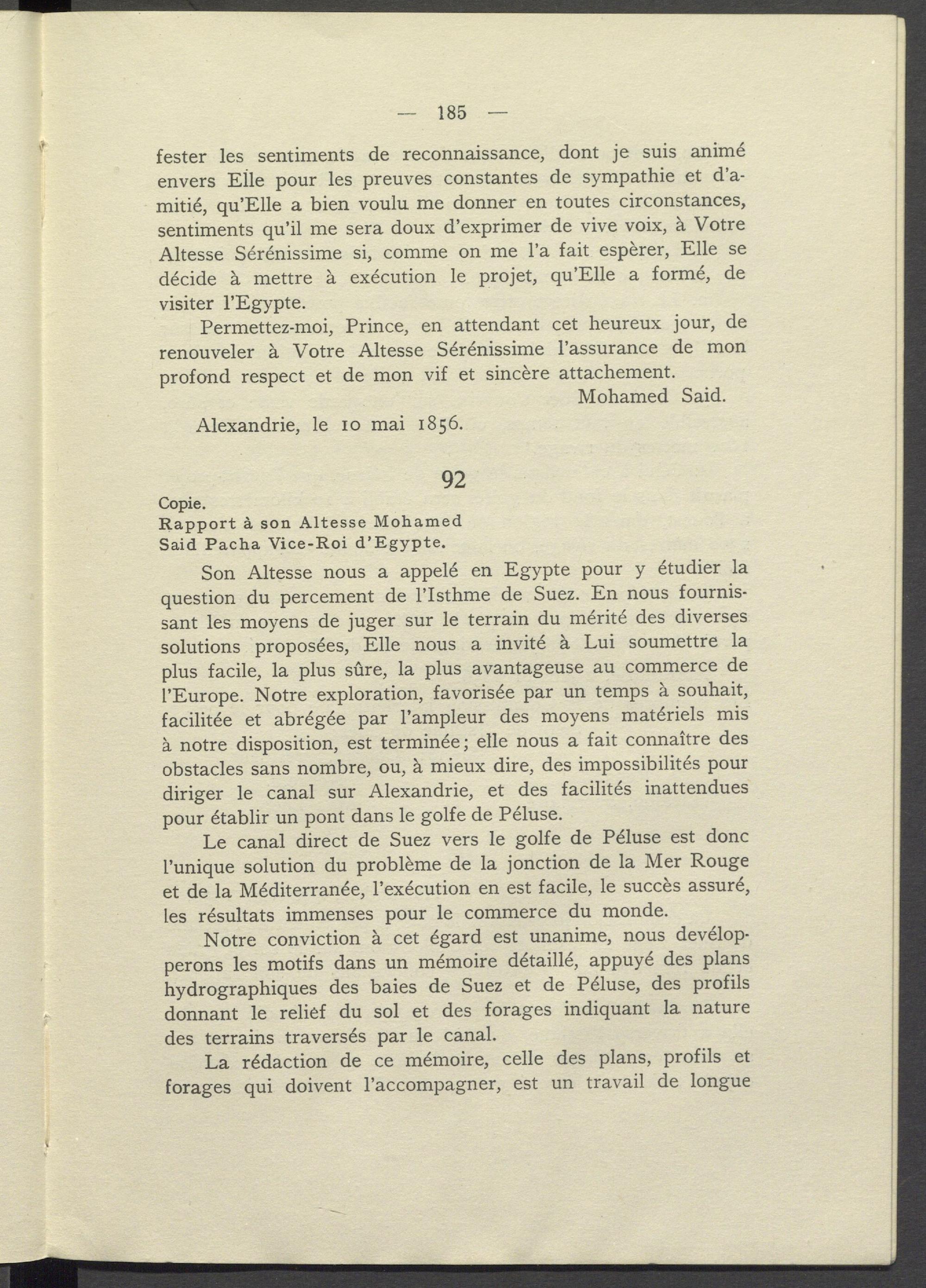 Son Altesse nous a appelé en Egypte pour y étudier la question du percement de l'Isthme de Suez. En nous fournissant les moyens de juger sur le terrain du mérité des diverses solutions proposées, Elle nous a invité à Lui soumettre la plus facile, la plus sûre, la plus avantageuse au commerce de l'Europe. Notre exploration, favorisée par un temps à souhait, facilitée et abrégée par l'ampleur des moyens matériels mis à notre disposition, est terminée; elle nous a fait connaître des obstacles sans nombre, ou, à mieux dire, des impossibilités pour diriger le canal sur Alexandrie, et des facilités inattendues pour établir un pont dans le golfe de Péluse.