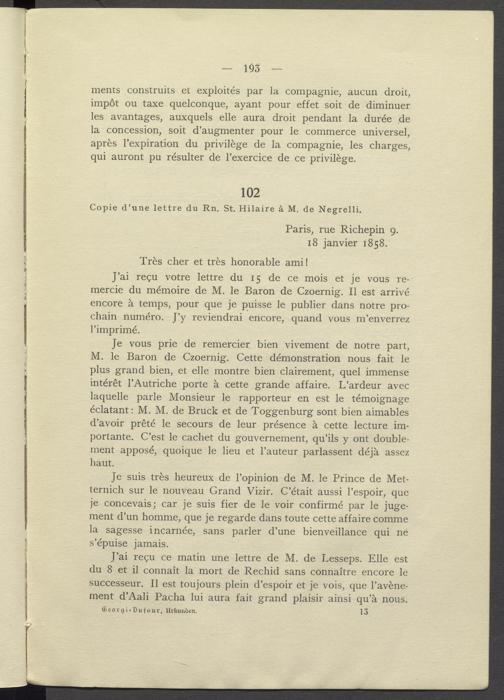J'ai reçu ce matin une lettre de M. de Lesseps. Elle est du 8 et il connaît la mort de Rechid sans connaître encore le successeur. Il est toujours plein d'espoir et je vois, que l'avènement d'Aali Pacha lui aura fait grand plaisir ainsi qu'à nous.