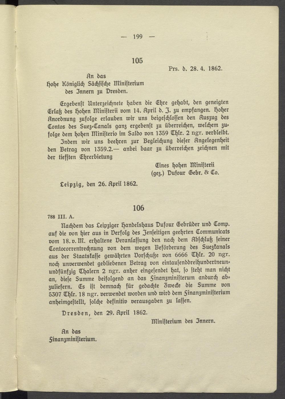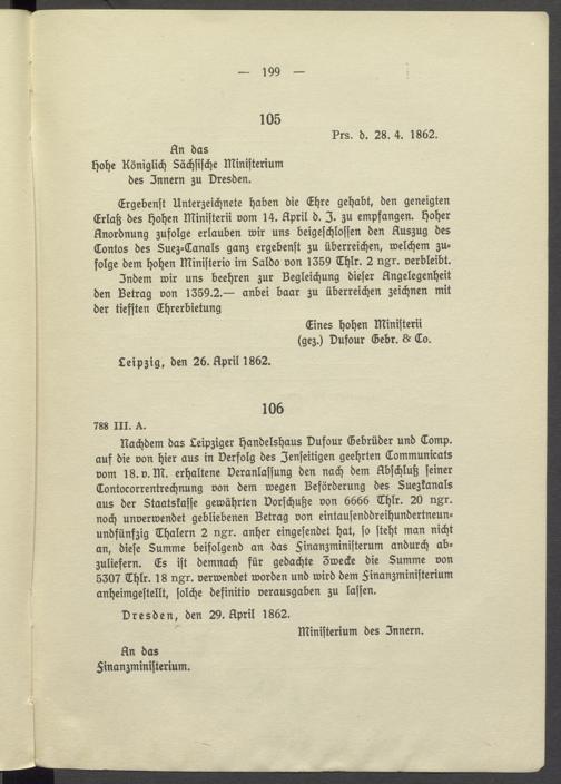 Nachdem das Leipziger Handelshaus Dufour Gebrüder und Comp. auf die von hier aus in Verfolg des Jenseitigen geehrten Communicats vom 18. v. m. erhaltene Veranlassung den nach dem Abschluß seiner Contocorrentrechnung von dem wegen Beförderung des Suezkanals aus der Staatskasse gewährten Vorschuße von 6666 Thlr. 20 ngr. noch unverwendet gebliebenen Betrag von eintausenddreihundertneunundfünfzig Thalern 2 ngr. anher eingesendet hat, so steht man nicht an, diese Summe beifolgend an das Finanzministerum andurch ab= zuliefern. Es ist demnach für gedachte 3wecke die Summe von 5307 Thlr. 18 ngr. verwendet worden und wird dem Finanzministerium anheimgestellt, solche definitiv verausgaben zu lassen.