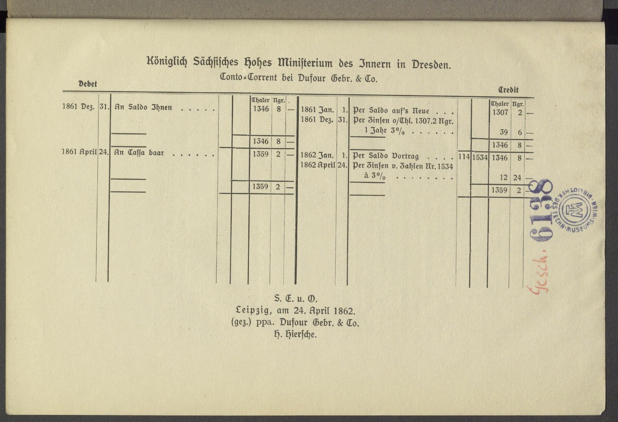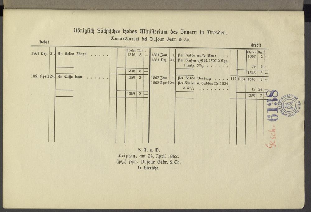 Leipzig, am 24. April 1862. ( gez.) ppa. Dufour Gebr.& To. H. Hiersche.
