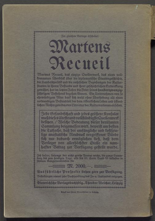 Jede Gesandtschaft und jedes größere Konsulat muß dieses älteste und vollständigste Quelleniverk besitzen./ Welche Bedeutung dieser berühmten Sammlung beigemessen wird, beweist am besten die Tatsache, daß der umfängliche und kostspielige anastatische Neudruck vergriffener Bände sich nur dadurch ermöglichen ließ, daß dem Verleger von allerhöchster Stelle ein namhafter Betrag zur Verfügung gestellt wurde.