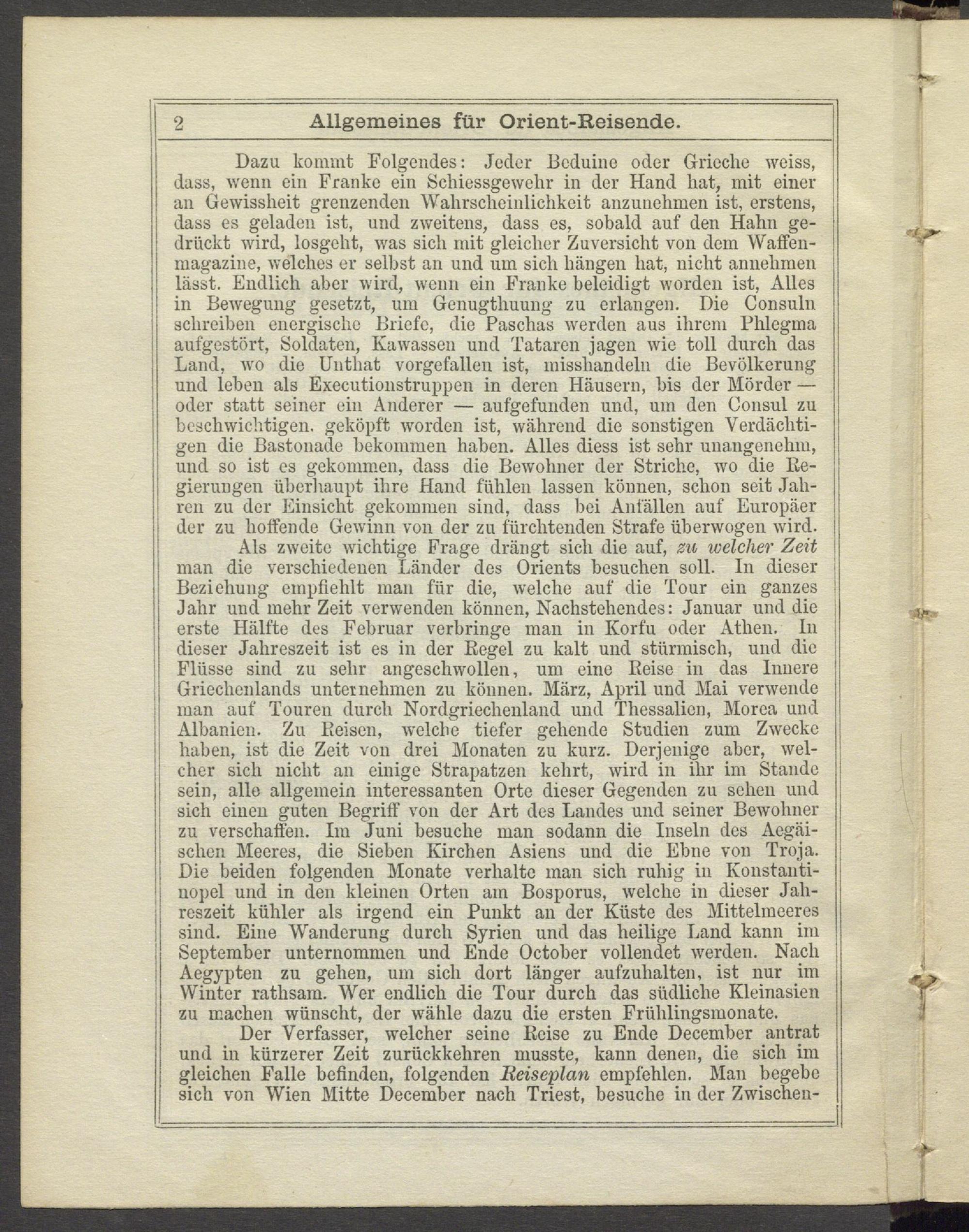 Dazu kommt Folgendes: Jeder Beduine oder Grieche weiss, dass, wenn ein Franke ein Schiessgewchr in der Hand hat, mit einer an Gewissheit grenzenden Wahrscheinlichkeit anzunehmen ist, erstens, : dass es geladen ist, und zweitens, dass es, sobald auf den Hahu ge- j drückt wird, losgeht, was sich mit gleicher Zuversicht von dem Waffen- ! magazine, welches er selbst an und um sich hängen hat, nicht annelmien lässt. Endlich aber wird, wenn ein Franke beleidigt worden ist, Alles in Bewegung gesetzt, um Genugthuung zu erlangen. Die Consuln schreiben energische Briefe, die Paschas werden aus ihrem Phlegma aufgestört, Soldaten, Kawassen und Tataren jagen wie toll durch das Land, wo die Unthat vorgefallen ist, misshandeln die Bevölkerung und leben als Executionstruppen in deren Häusern, bis der Mörder — oder statt seiner ein Anderer — aufgefunden und, um den Consul zu beschwichtigen, geköpft worden ist, während die sonstigen Verdächtigen die Bastonade bekommen haben. Alles diess ist sehr unangenehm, ! und so ist es gekommen, dass die Bewohner der Striche, wo die Re- gierungen überhaupt ihre Hand fühlen lassen können, schon seit Jahren zu der Einsicht gekommen sind, dass bei Anfällen auf Europäer ; der zu hoffende Gewinn von der zu fürchtenden Strafe überwogen wird, j Als zweite wichtige Frage drängt sich die auf, zu welcher Zeit ! man die verschiedenen Länder des Orients besuchen soll. In dieser i Beziehung empfiehlt man für die, welche auf die Tour ein ganzes ! Jahr und mehr Zeit verwenden können, Nachstehendes: Januar und die erste Hälfte des Februar verbringe man in ICorfu oder Athen, ln j dieser Jahreszeit ist es in der Regel zu kalt und stürmisch, und die i Flüsse sind zu sehr angeschwollen, um eine Reise in das Innere Griechenlands unternehmen zu können. März, April und Mai verwende man auf Touren durch Nordgriechenland und Thessalien, Morea und i Albanien. Zu Reisen, welche tiefer gehende Studien zum Zwecke | haben, ist die Zeit von drei Monaten zu kurz. Derjenige aber, welcher sich nicht an einige Strapatzen kehrt, wird in ihr im Stande sein, alle allgemein interessanten Orte dieser Gegenden zu sehen und sich einen guten Begriff von der Art des Landes und seiner Bewohner zu verschaffen. Im Juni besuche man sodann die Inseln des Aegäi- sclien Meeres, die Sieben Kirchen Asiens und die Ebne von Troja. Die beiden folgenden Monate verhalte man sich ruhig in Ivonstanti- uopel und in den kleinen Orten am Bosporus, welche in dieser Jah- j reszeit kühler als irgend ein Punkt an der Küste des Mittelmeeres i sind. Eine Wanderung durch Syrien und das heilige Land kann im September unternommen und Ende October vollendet werden. Nach j Aegypten zu gehen, um sich dort länger aufzuhalten, ist nur im Winter rathsam. Wer endlich die Tour durch das südliche Kleinasien zu machen wünscht, der wähle dazu die ersten Frühlingsmonate.