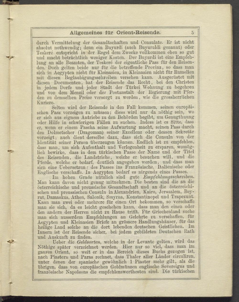 Im hohen Grade nützlich sind gute Empfehlungsschreiben. Man kann davon nicht genug mitnehmen. Die besten sind die an die österreichische und preussische Gesandtschaft und an die österreichischen und preussischcn Consuln in Alexandrien, Kairo, Jerusalem, Bey- rut. Damaskus, Athen, Salonik, Smyrna, Konstantinopel und Trapezunt. Kann man zwei oder mehrere für einen Ort bekommen, so verschaffe man sie sich, da es leicht geschehen kann, dass man den einen oder | den andern der Herren nicht zu Hause trifft. Für Griechenland suche man sich ausserdem Empfehlungen an Gelehrte zu verschaffen, für ! Aegypten und Kleinasien Briefe an grössere Handlungshäuser, für das heilige Land solche an die dort lebenden deutschen Geistlichen. Im Innern ist der Reisende sicher, bei jedem gebildeten Deutschen Rath und Auskunft zu finden.