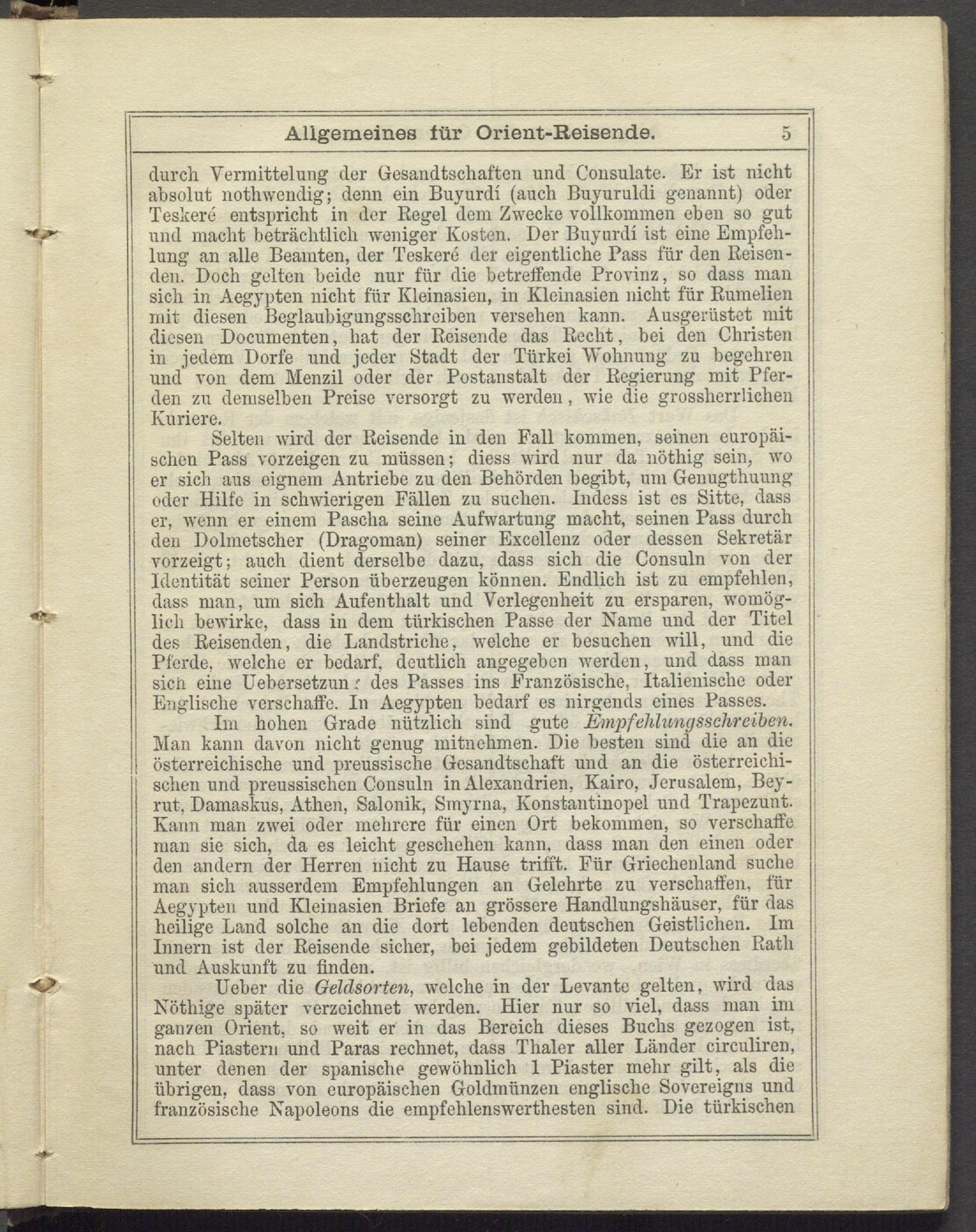 Selten wird der Reisende in den Pall kommen, seinen europäischen Pass vorzeigen zu müssen; diess wird nur da nöthig sein, wo er sich aus eignem Antriebe zu den Behörden begibt, um Genugthuung oder Hilfe in schwierigen Fällen zu suchen. Indess ist es Sitte, dass er, wenn er einem Pascha seine Aufwartung macht, seinen Pass durch den Dolmetscher (Dragoman) seiner Excellenz oder dessen Sekretär vorzeigt; auch dient derselbe dazu, dass sich die Consuln von der Identität seiner Person überzeugen können. Endlich ist zu empfehlen, dass man, um sich Aufenthalt und Verlegenheit zu ersparen, womöglich bewirke, dass in dem türkischen Passe der Name und der Titel des Reisenden, die Landstriche, welche er besuchen will, und die Pferde, welche er bedarf, deutlich angegeben werden, und dass man sicfi eine Uebersetzun.' des Passes ins Französische, Italienische oder Englische verschaffe. In Aegypten bedarf cs nirgends eines Passes.