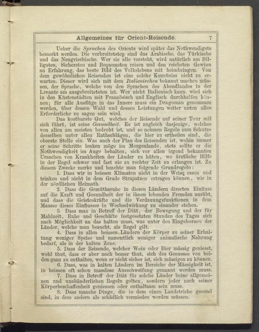 Das kostbarste Gut, welches der Reisende auf seiner Tour mit sich führt, ist seine Gesundheit. Es ist zugleich dasjenige, welches von allen am meisten bedroht ist, und so nehmen Regeln zum Schutze desselben unter allen Rathschlägen, die hier zu ertheilen sind, die oberste Stelle ein. Was auch der Plan des Reisenden ist, wohin immer er seine Schritte lenken möge im Morgenlande, stets sollte er die Nothwendigkeit im Auge behalten, sich vor allen irgend bekannten Ursachen von Krankheiten der Länder zu hüten, wo ärztliche Hilfe in der Regel schwer und fast nie zu rechter Zeit zu erlangen ist. Zu diesem Zwecke merke und beachte man folgende Grundregeln: