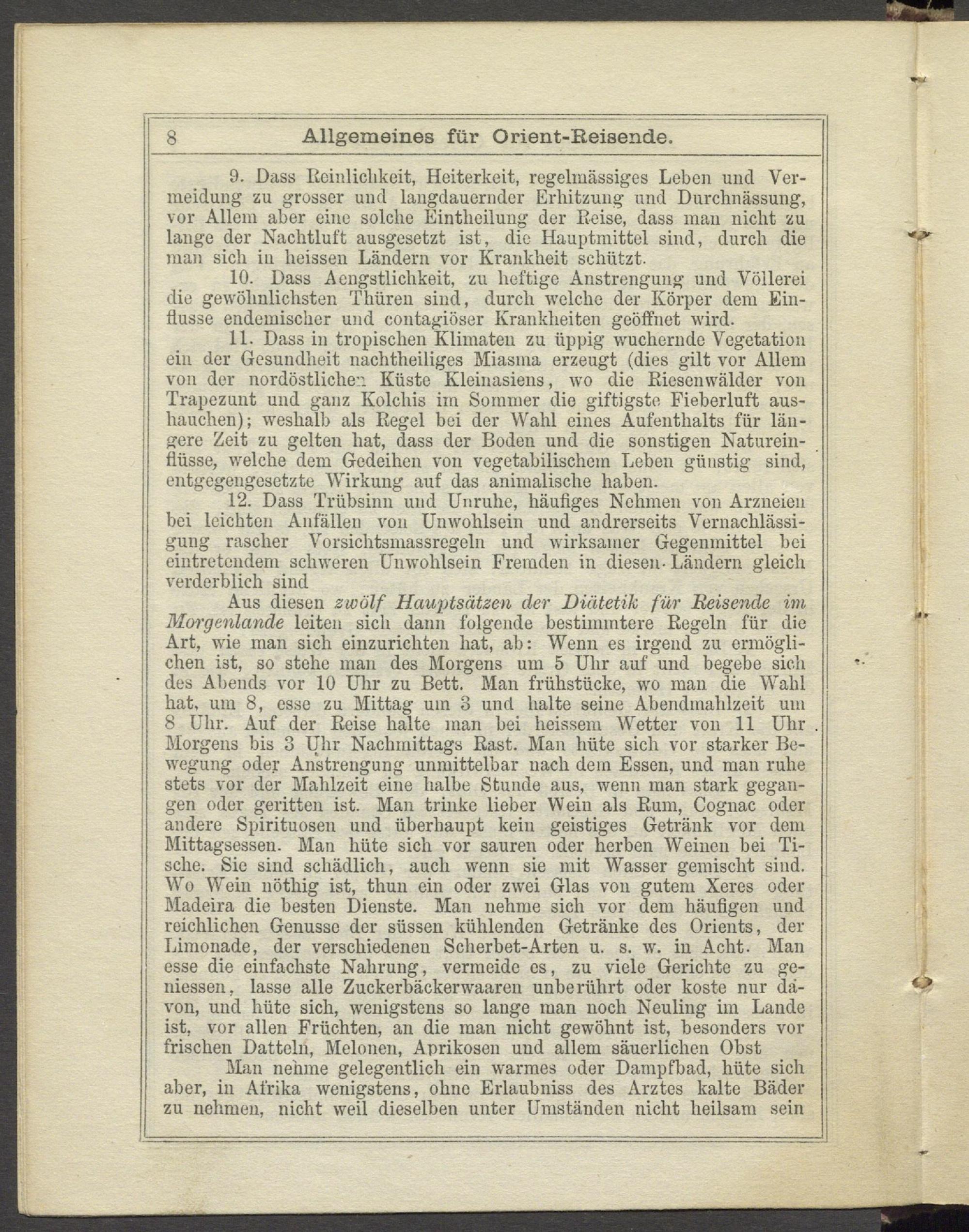 9. Dass Reinlichkeit, Heiterkeit, regelmässiges Leben und Vermeidung zu grosser und langdauernder Erhitzung und Durchnässung, vor Allem aber eine solche Eintheiluug der Reise, dass mau nicht zu lange der Nachtluft ausgesetzt ist, die Hauptmittel sind, durch die man sich in heissen Ländern vor Krankheit schützt.