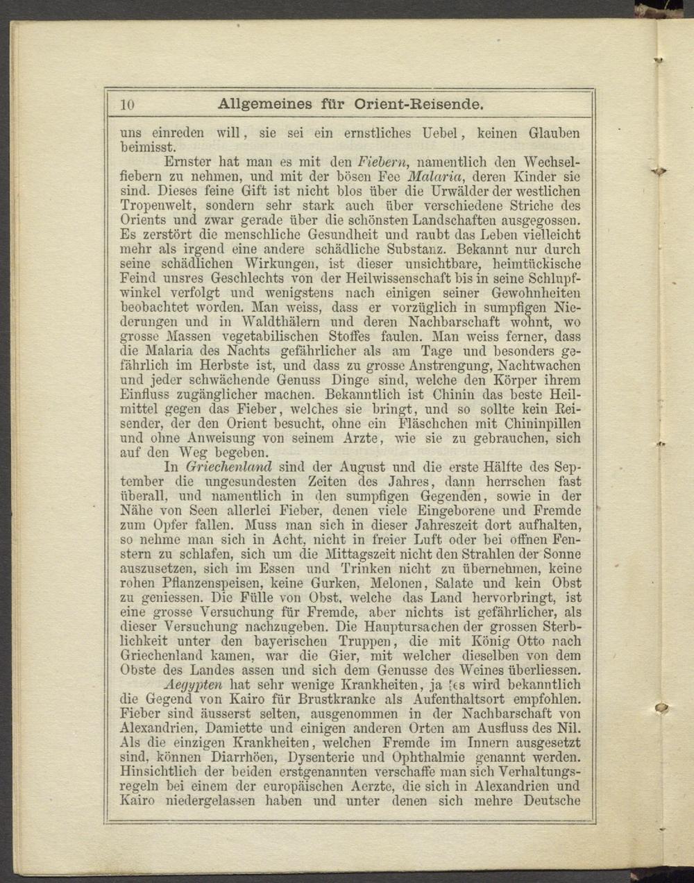 Ernster hat man es mit den Fiebern, namentlich den Wechselfiebern zu nehmen, und mit der bösen Fee Malaria, deren Kinder sie sind. Dieses feine Gift ist nicht blos über die Urwälder der westlichen Tropenwelt, sondern sehr stark auch über verschiedene Striche des Orients und zwar gerade über die schönsten Landschaften ausgegossen. Es zerstört die menschliche Gesundheit und raubt das Leben vielleicht mehr als irgend eine andere schädliche Substanz. Bekannt nur durch seine schädlichen Wirkungen, ist dieser unsichtbare, heimtückische Feind unsres Geschlechts von der Heilwissenschaft bis in seine Schlupfwinkel verfolgt und wenigstens nach einigen seiner Gewohnheiten beobachtet worden. Man weiss, dass er vorzüglich in sumpfigen Niederungen und in Waklthälern und deren Nachbarschaft wohnt, wo grosse Massen vegetabilischen Stoffes faulen. Man weiss ferner, dass die Malaria des Nachts gefährlicher als am Tage und besonders gefährlich im Herbste ist, und dass zu grosse Anstrengung, Nachtwachen und jeder schwächende Genuss Dinge sind, welche den Körper ihrem Einfluss zugänglicher machen. Bekanntlich ist Chinin das beste Heilmittel gegen das Fieber, welches sie bringt, und so sollte kein Reisender, der den Orient besucht, ohne ein Fläschchen mit Chininpillen und ohne Anweisung von seinem Arzte, wie sie zu gebrauchen, sich auf den Weg begeben.