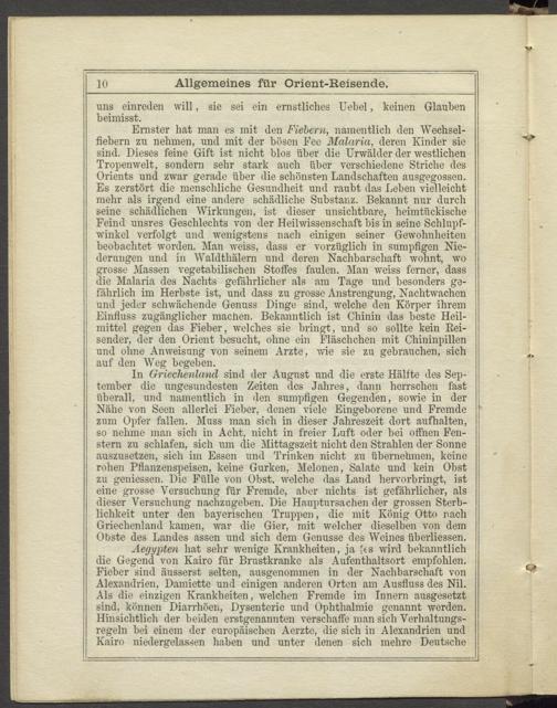 Aegypten hat sehr wenige Krankheiten, ja Its wird bekanntlich die Gegend von Kairo für Brustkranke als Aufenthaltsort empfohlen. Fieber sind äusserst selten, ausgenommen in der Nachbarschaft von Alexandrien, Damiette und einigen anderen Orten am Ausfluss des Nil. Als die einzigen Krankheiten, welchen Fremde im Innern ausgesetzt sind, können Diarrhöen, Dysenterie und Ophthalmie genannt werden. Hinsichtlich der beiden erstgenannten verschaffe man sich Verhaltungsregeln bei einem der europäischen Aerzte, die sich in Alexandrien und Kairo niedergelassen haben und unter denen sich mehre Deutsche
