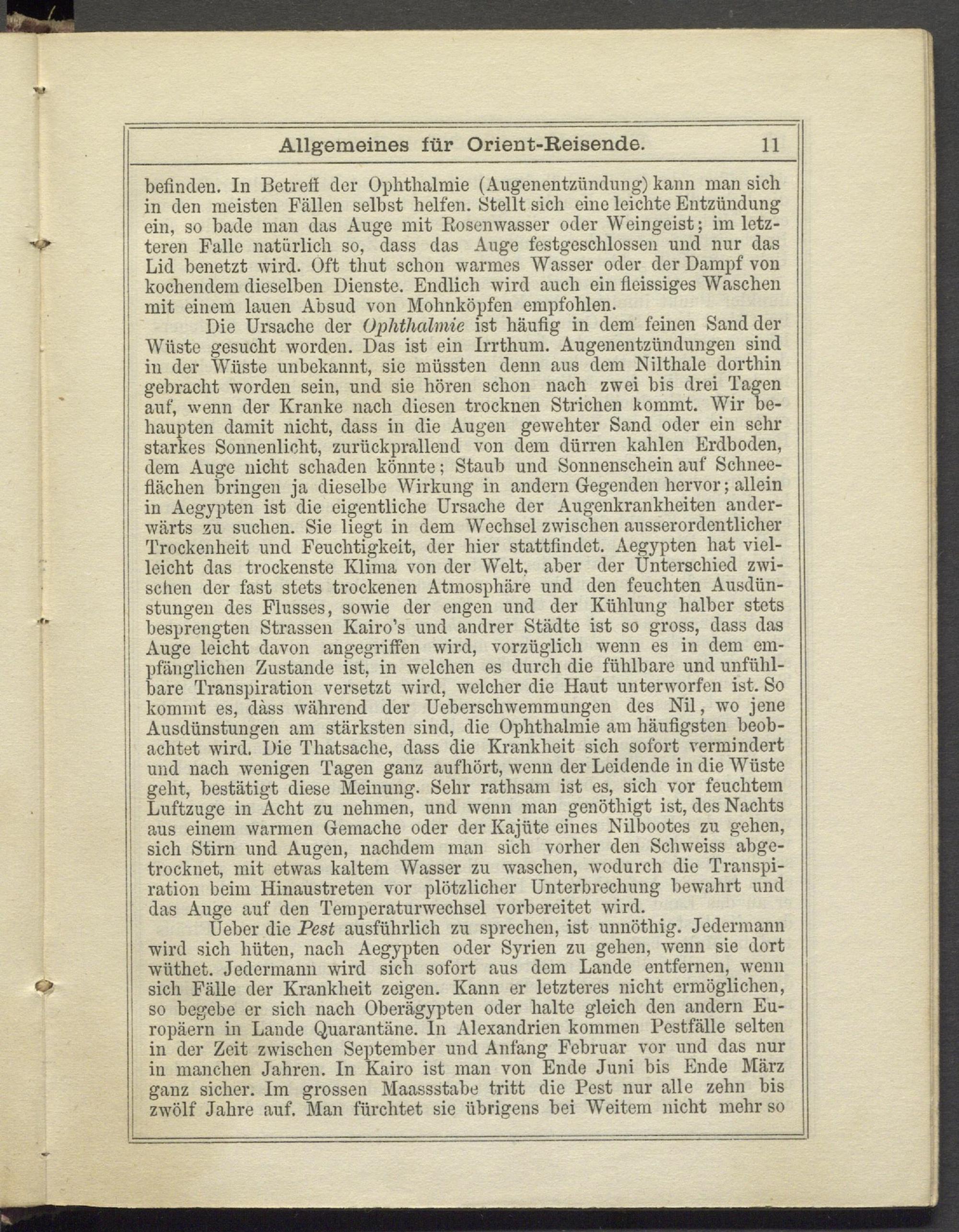 Ueber die Pest ausführlich zu sprechen, ist unnöthig. Jedermann wird sich hüten, nach Aegypten oder Syrien zu gehen, wenn sie dort wütliet. Jedermann wird sich sofort aus dem Lande entfernen, wenn sich Fälle der Krankheit zeigen. Kann er letzteres nicht ermöglichen, so begebe er sich nach Oberägypten oder halte gleich den andern Europäern in Lande Quarantäne, ln Alexandrien kommen Pestfälle selten in der Zeit zwischen September und Anfang Februar vor und das nur : in manchen Jahren. In Kairo ist man von Ende Juni bis Ende März ganz sicher. Im grossen Maassstabe tritt die Pest nur alle zehn bis zwölf Jahre auf. Man fürchtet sie übrigens bei Weitem nicht mehr so
