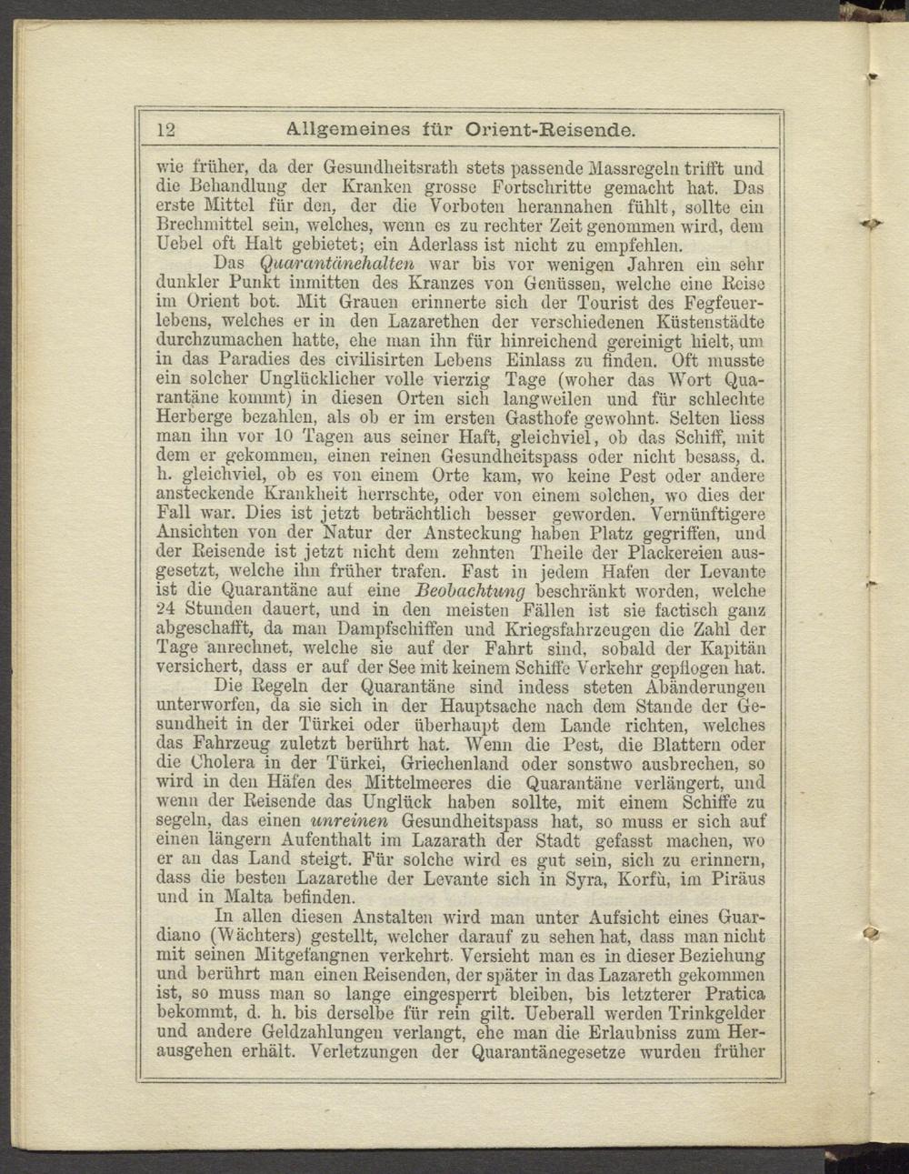 In allen diesen Anstalten wird man unter Aufsicht eines Guardiano (W ächters) gestellt, welcher darauf zu sehen hat, dass man nicht mit seinen Mitgefangnen verkehrt. Versieht man es in dieser Beziehung und berührt man einen Reisenden, der später in das Lazareth gekommen ist, so muss man so lange eingesperrt bleiben, bis letzterer Pratica bekommt, d. h. bis derselbe für rein gilt. Ueberall werden Trinkgelder und andere Geldzahlungen verlangt, ehe man die Erlaubniss zum Herausgehen erhält. Verletzungen der Quarantänegesetze wurden früher