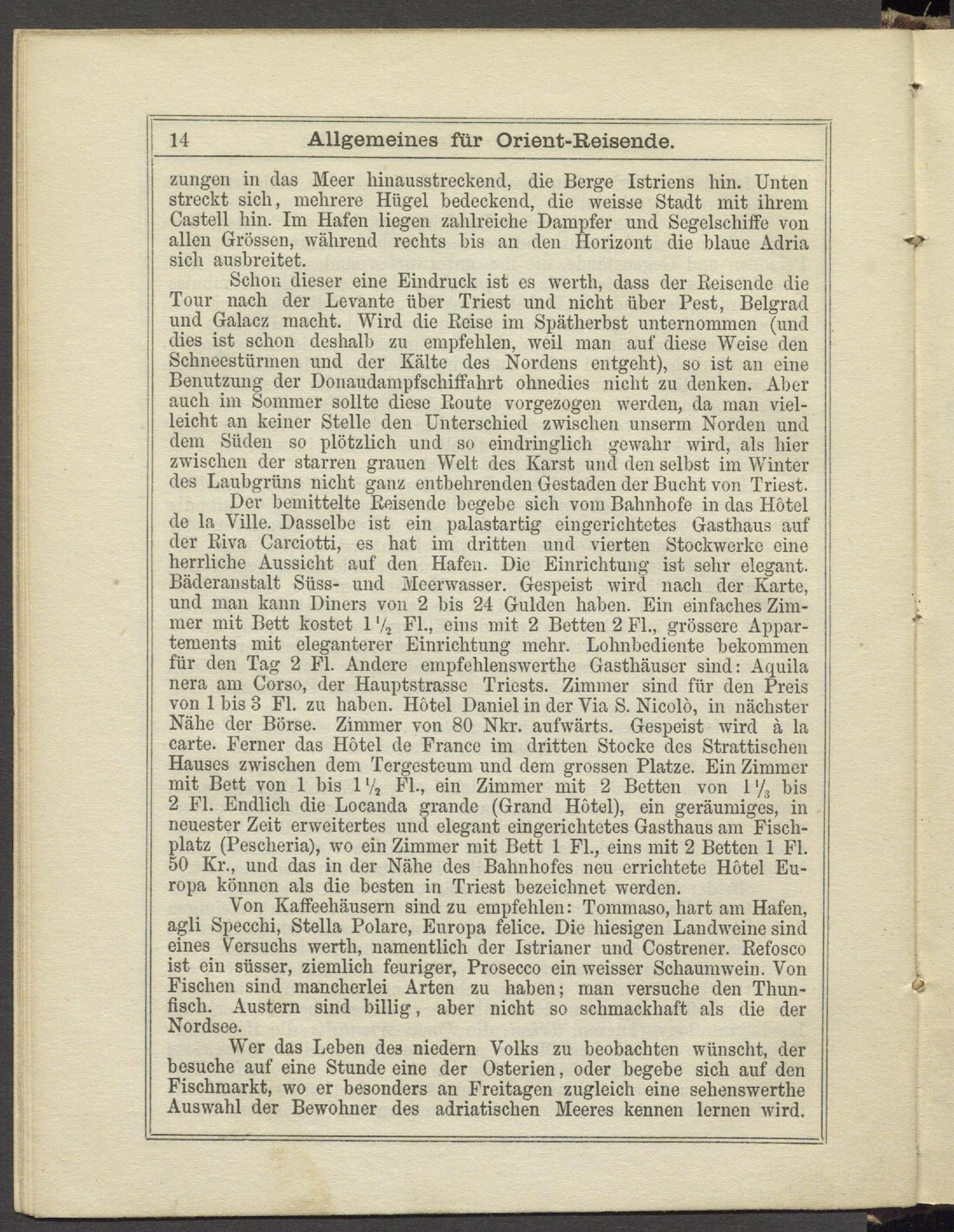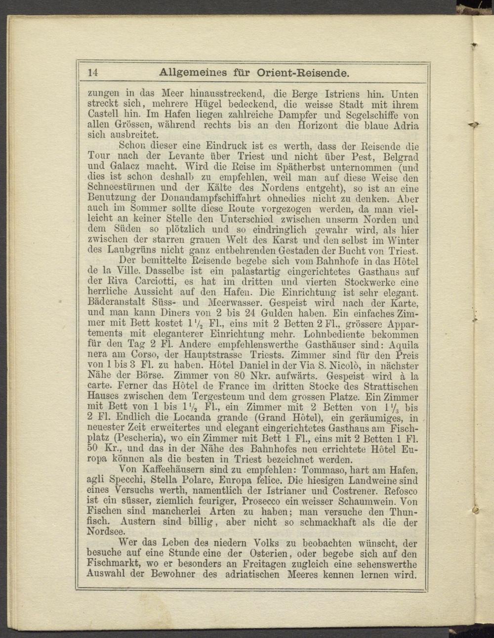 Der bemittelte Reisende begebe sich vom Bahnhofe in das Hotel de la Ville. Dasselbe ist ein palastartig eingerichtetes Gasthaus auf I der Riva Carciotti, es hat im dritten und vierten Stockwerke eine herrliche Aussicht auf den Hafen. Die Einrichtung ist sehr elegant. Bäderanstalt Süss- und Meerwasser. Gespeist wird nach der Karte, und man kann Diners von 2 bis 24 Gulden haben. Ein einfaches Zimmer mit Bett kostet 1 '4 PL, eins mit 2 Betten 2 Fl., grössere Appar- i tements mit eleganterer Einrichtung mehr. Lohnbediente bekommen für den Tag 2 PI. Andere empfehlenswerthe Gasthäuser sind: Aquila j nera am Corso, der Hauptstrasse Triests. Zimmer sind für den Preis 1 von 1 bis 3 PI. zu haben. Hotel Daniel in der Via S. Nicolö, in nächster Nähe der Börse. Zimmer von 80 Nkr. aufwärts. Gespeist wird ä la carte. Ferner das Hotel de France im dritten Stocke des Strattisclien j Hauses zwischen dem Tergesteum und dem grossen Platze. Ein Zimmer ! mit Bett von 1 bis 1 '4 Fl., ein Zimmer mit 2 Betten von 1 '/ 3 bis 2 Fl. Endlich die Locanda grande (Grand Hotel), ein geräumiges, in neuester Zeit erweitertes und elegant eingerichtetes Gasthaus am Fischplatz (Pesclieria), wo ein Zimmer mit Bett 1 Fl., eins mit 2 Betten 1 Fl.