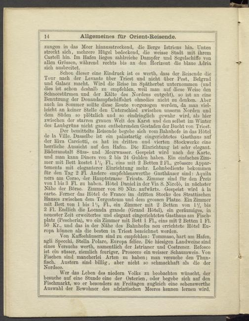 50 Kr., und das in der Nähe des Bahnhofes neu errichtete Hotel Europa können als die besten in Triest bezeichnet werden.