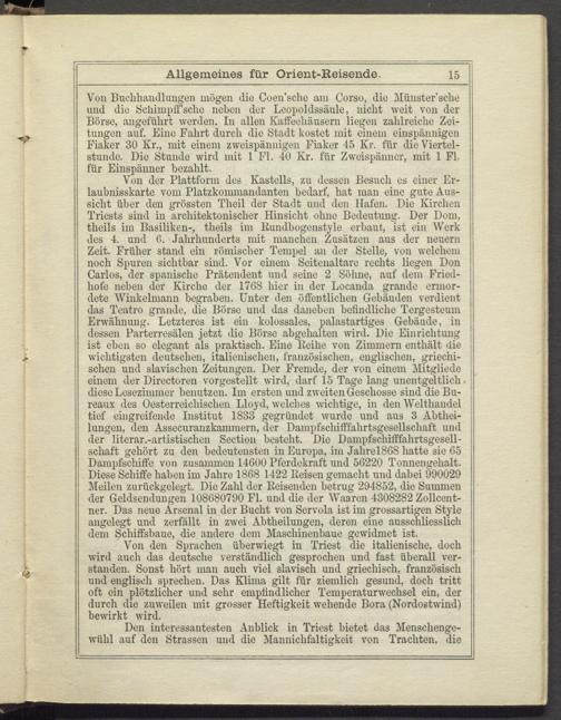Von Buchhandlungen mögen die Coen’sclie am Corso, die Münster’sclie und die SchimpiTschc neben der Lcopoldssäule, nicht weit von der Börse, angeführt werden. In allen Kaffeehäusern liegen zahlreiche Zeitungen auf. Eine Fahrt durch die Stadt kostet mit einem einspännigen Fiaker 30 Kr., mit einem zweispännigen Fiaker 45 Kr. für die Viertelstunde. Die Stunde wird mit 1 Fl. 40 Kr. für Zweispänner, mit 1 Fl. für Einspänner bezahlt.