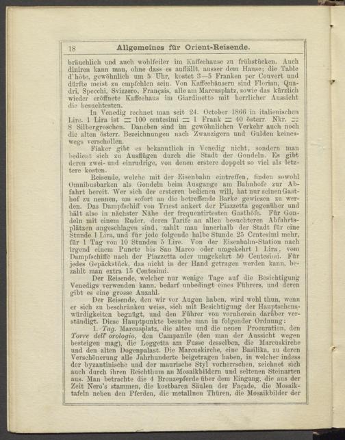 1. Tag. Marcusplatz, die alten und die neuen Procuratien, den Torre delV orologio, den Campanile (den man der Aussicht wegen besteigen mag), die Loggetta am Fusse desselben, die Marcuskirche und den alten Dogenpalast. Die Marcuskirche, eine Basilika, zu deren Verschönerung alle Jahrhunderte beigetragen haben, in welcher indess der byzantinische und der maurische Styl vorherrschen, zeichnet sich auch durch ihren Reichtliuin an Mosaikbildem und seltenen Steinarten [ aus. Man betrachte die 4 Bronzepferde über dem Eingang, die aus der Zeit Nero’s stammen, die kostbaren Säulen der Façade, die Mosaiktafeln neben den Pferden, die metallnen Thüren. die Mosaikbilder der