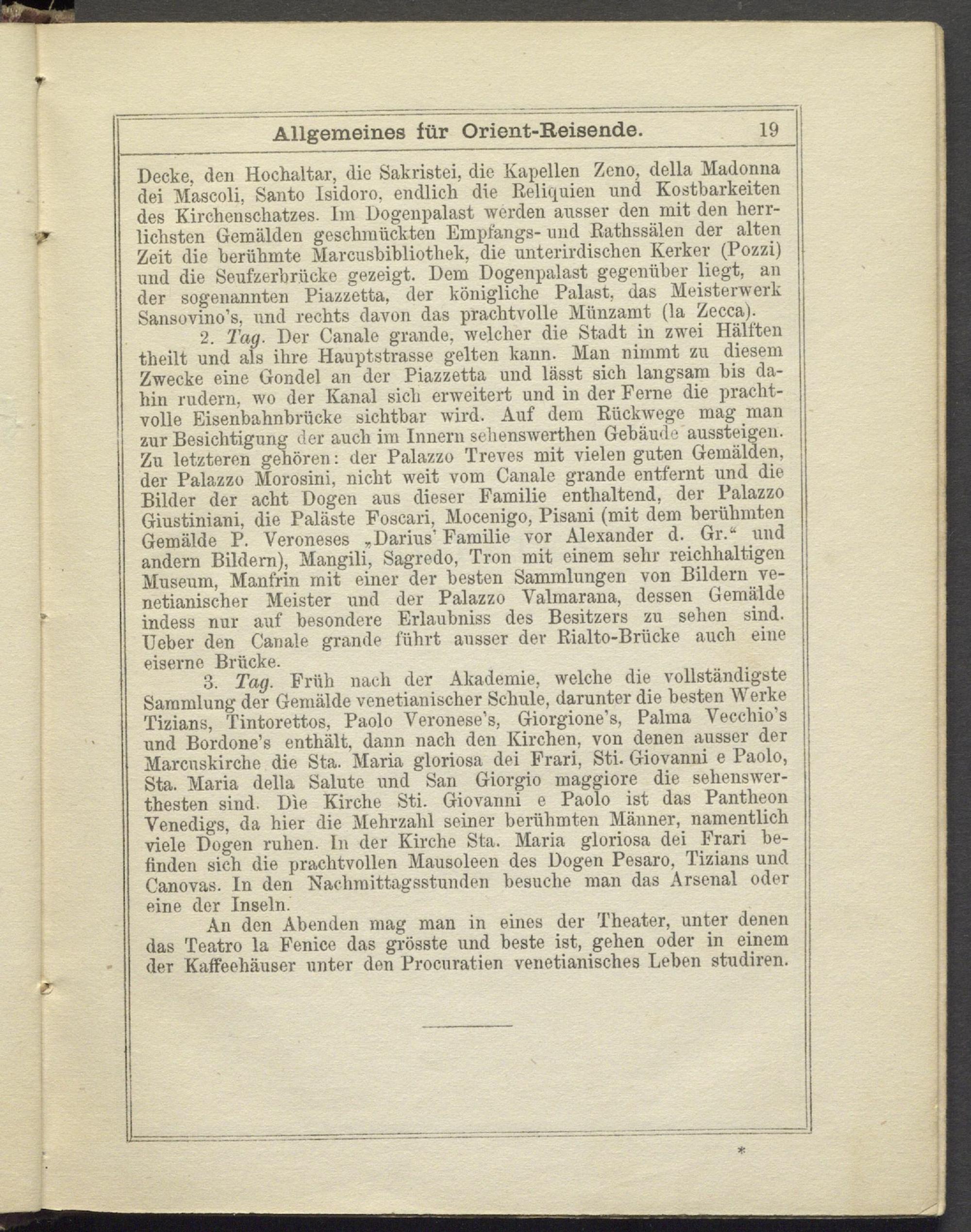 3. Tag. Früh nach der Akademie, welche die vollständigste Sammlung der Gemälde venetianischer Schule, darunter die besten Werke Tizians, Tintorettos, Paolo Veronese’s, Giorgione's, Palma Vecchio’s und Bordone’s enthält, dann nach den Kirchen, von denen ausser der Marenskirche die Sta. Maria gloriosa dei Frari, Sti. Giovanni e Paolo, Sta. Maria della Salute und San Giorgio maggiore die selienswer- thesten sind. Die Kirche Sti. Giovanni e Paolo ist das Pantheon Venedigs, da hier die Mehrzahl seiner berühmten Männer, namentlich viele Dogen ruhen, ln der Kirche Sta. Maria gloriosa dei Frari befinden sich die prachtvollen Mausoleen des Dogen Pesaro, Tizians und Canovas. ln den Machmittagsstunden besuche man das Arsenal oder eine der Inseln.