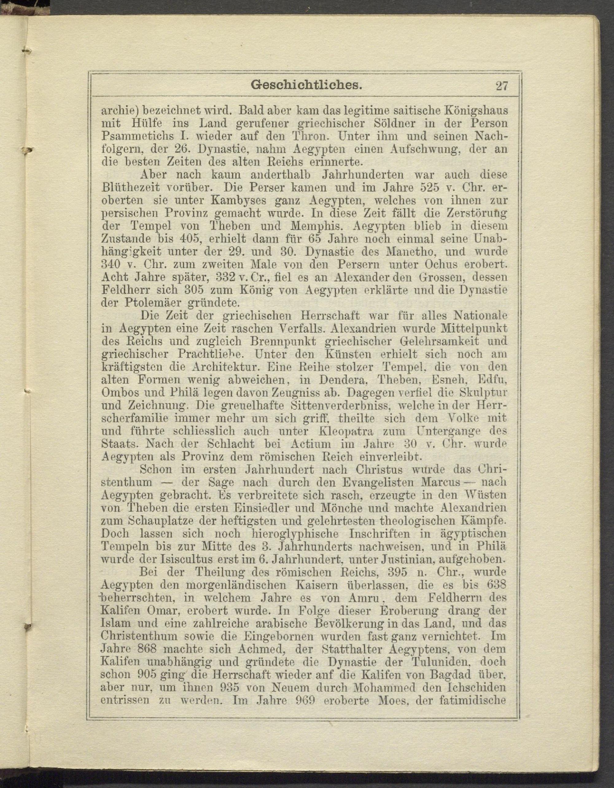 Aber nach kaum anderthalb Jahrhunderten war auch diese Bliithezeit vorüber. Die Perser kamen und im Jahre 525 v. Chr. eroberten sie unter Kambyses ganz Aegypten, welches von ihnen zur persischen Provinz gemacht wurde. In diese Zeit fällt die Zerstörung der Tempel von Theben und Memphis. Aegypten blieb in diesem Zustande bis 405, erhielt dann für 65 Jahre noch einmal seine Unabhängigkeit unter der 29. und 30. Dynastie des Manetho. und wurde 340 v. Chr. zum zweiten Male von den Persern unter Ochus erobert. Acht Jahre später, 332 v. Cr., fiel es an Alexander den Grossen, dessen Feldherr sich 305 zum König von Aegypten erklärte und die Dynastie der Ptolemäer gründete.