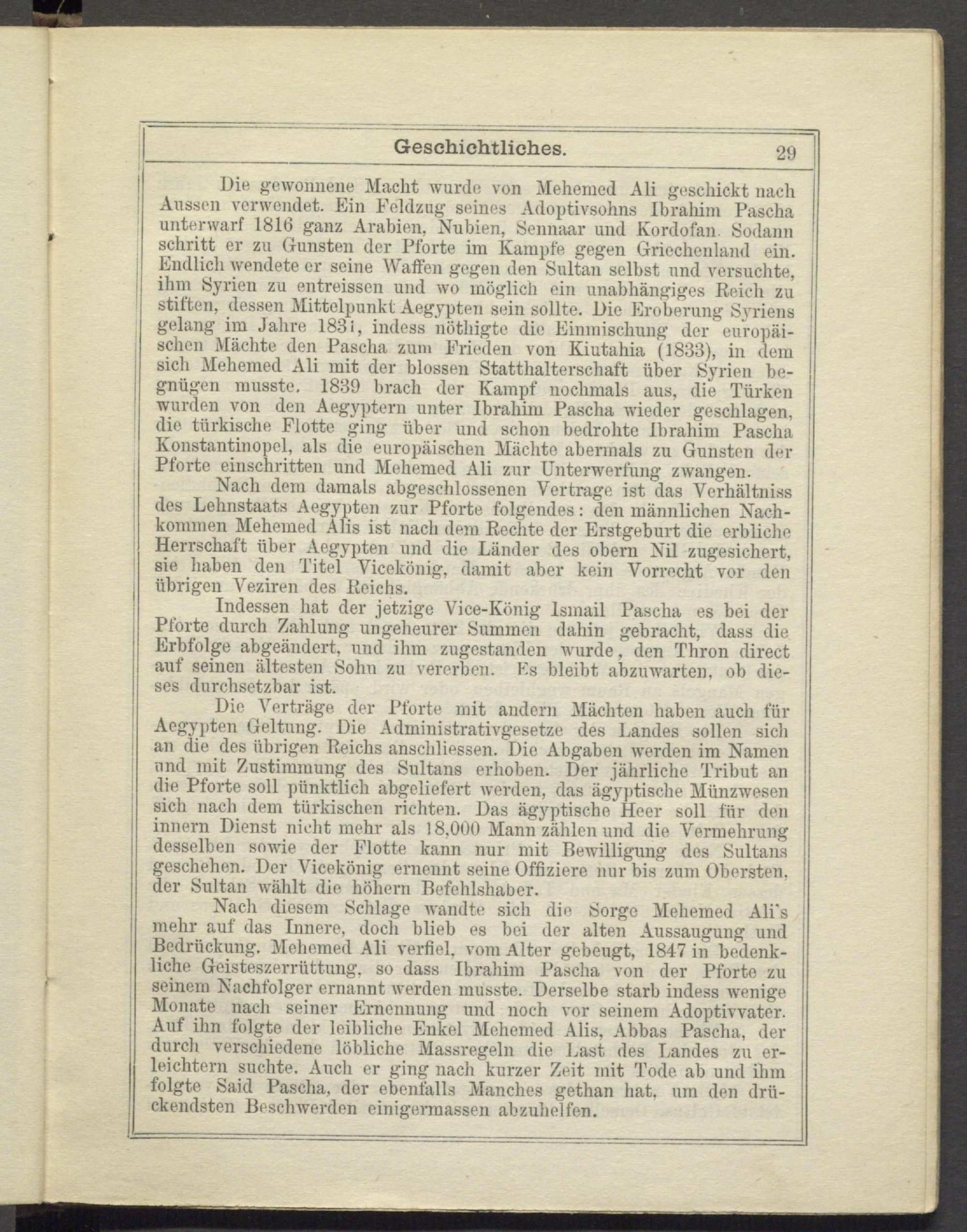 : Aussen verwendet. Ein Feldzug seines Adoptivsohns Ibrahim Pascha unterwarf 1816 ganz Arabien, Nubien, Seimaar und Kordofan. Sodann schritt er zu Gunsten der Pforte im Kampfe gegen Griechenland ein. > Endlich wendete er seine Waffen gegen den Sultan selbst und versuchte, i ihm Syrien zu entreissen und wo möglich ein unabhängiges Reich zu stiften, dessen Mittelpunkt Aegypten sein sollte. Die Eroberung Syriens gelang im Jahre 183 i, indess nöthigte die Einmischung der europäischen Mächte den Pascha zum Frieden von Kiutahia (1833), in dem | sich Mehemed Ali mit der blossen Statthalterschaft über Syrien be- i gnügen musste. 1839 brach der Kampf nochmals aus, die Türken ; wurden von den Aegyptern unter Ibrahim Pascha wieder geschlagen, die türkische Flotte ging über und schon bedrohte Ibrahim Pascha Konstantinopel, als die europäischen Mächte abermals zu Gunsten der Pforte einschritten und Mehemed Ali zur Unterwerfung zwangen.