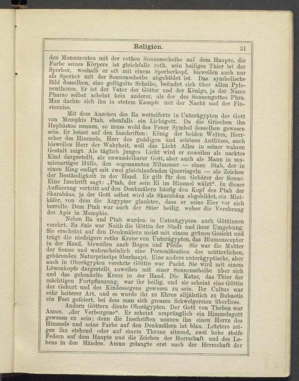 den Monumenten mit der rothen Sonnenscheibe auf dem Haupte, die Farbe seines Körpers ist gleichfalls roth, sein heiliges Tüier ist der Sperber, weshalb er oft mit einem Sperberkopf, bisweilen auch nur als Sperber mit der Sonnenscheibe abgebildet ist. Das symbolische Bild desselben, eine geflügelte Scheibe, befindet sich über allen Pylonenthoren. Kr ist der Vater der Götter und der Könige, ja der Name Pharao selbst scheint kein anderer, als der des Sonnengottes Phra. Man dachte sich ihn in stetem Kampfe mit der Nacht und der Finsterniss.