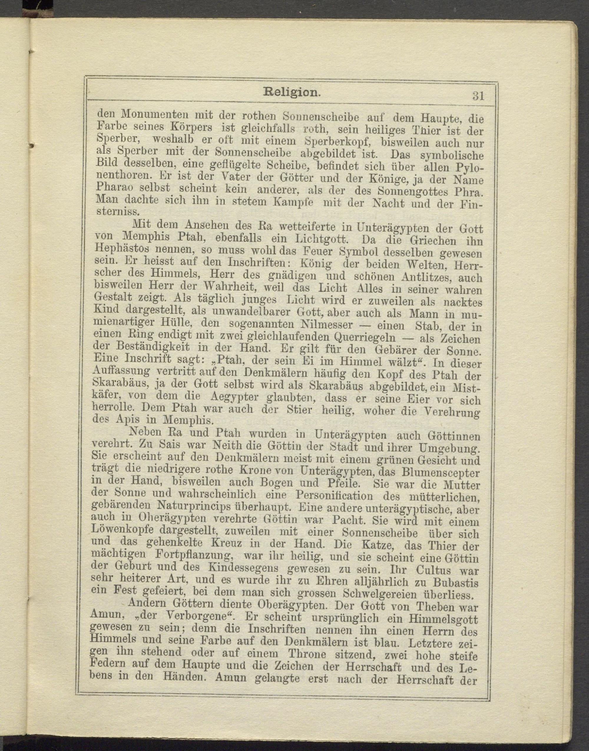 Neben Ba und Ptah wurden in Unterägypten auch Göttinnen verehrt. Zu Sais war Neitli die Göttin der Stadt und ihrer Umgebung. Sie erscheint auf den Denkmälern meist mit einem grünen Gesicht und trügt die niedrigere rothe Krone von ünterägypten, das Bluinenscepter in der Hand, bisweilen auch Bogen und Pfeile. Sie war die Mutter der Sonne und wahrscheinlich eine Personifikation des mütterlichen, gebärenden Naturprincips überhaupt. Eine andere unterägyptische, aber auch in Olierägyptcn verehrte Göttin war Pacht. Sie wird mit einem Löwonkopfe dargestellt, zuweilen mit einer Sonnenscheibe über sich und das gehenkelte Kreuz in der Hand. Die Katze, das Thier der mächtigen Fortpflanzung, war ihr heilig, und sie scheint eine Göttin der Geburt und des Kindessegens gewesen zu sein. Ihr Cultus war sehr heiterer Art, und es wurde ihr zu Ehren alljährlich zu Bubastis ein Fest gefeiert, bei dem man sich grossen Schwelgereien überliess.