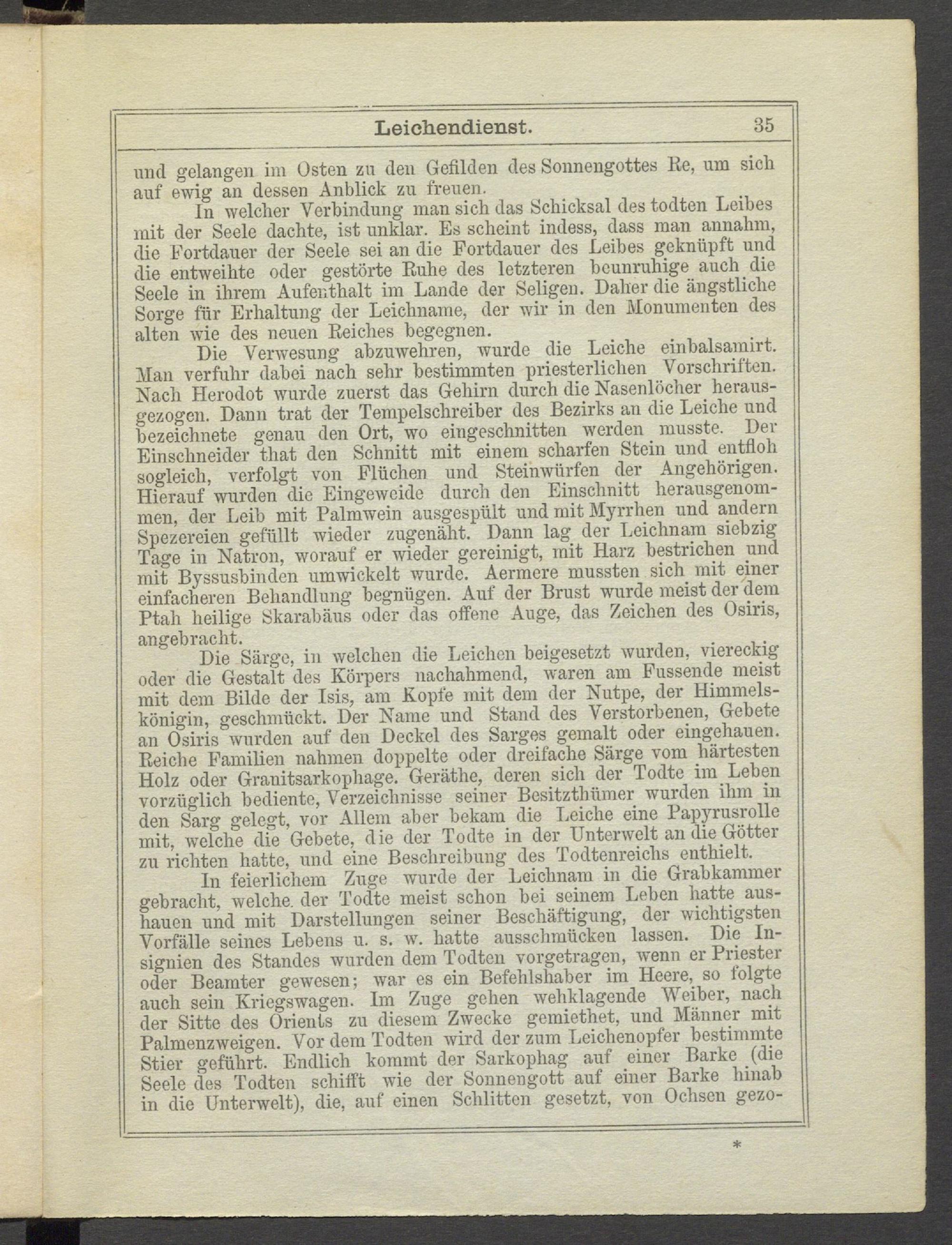 Die Särge, in welchen die Leichen beigesetzt wurden, viereckig oder die Gestalt des Körpers nachahmend, waren am Fussende meist mit dem Bilde der Isis, am Kopie mit dem der Nutpe, der Himmelskönigin, geschmückt. Der Name und Stand des Verstorbenen, Gebete an Osiris wurden auf den Deckel des Sarges gemalt oder eingehauen. Reiche Familien nahmen doppelte oder dreifache Särge vom härtesten Holz oder Granitsarkophage. Geräthe, deren sich der Todte im Lehen vorzüglich bediente, Verzeichnisse seiner Besitztlnimer wurden ihm in den Sarg gelegt, vor Allem aber bekam die Leiche eine Papyrusrolle mit, welche die Gebete, die der Todte in der Unterwelt an die Götter zu richten hatte, und eine Beschreibung des Todtenreiclis enthielt.