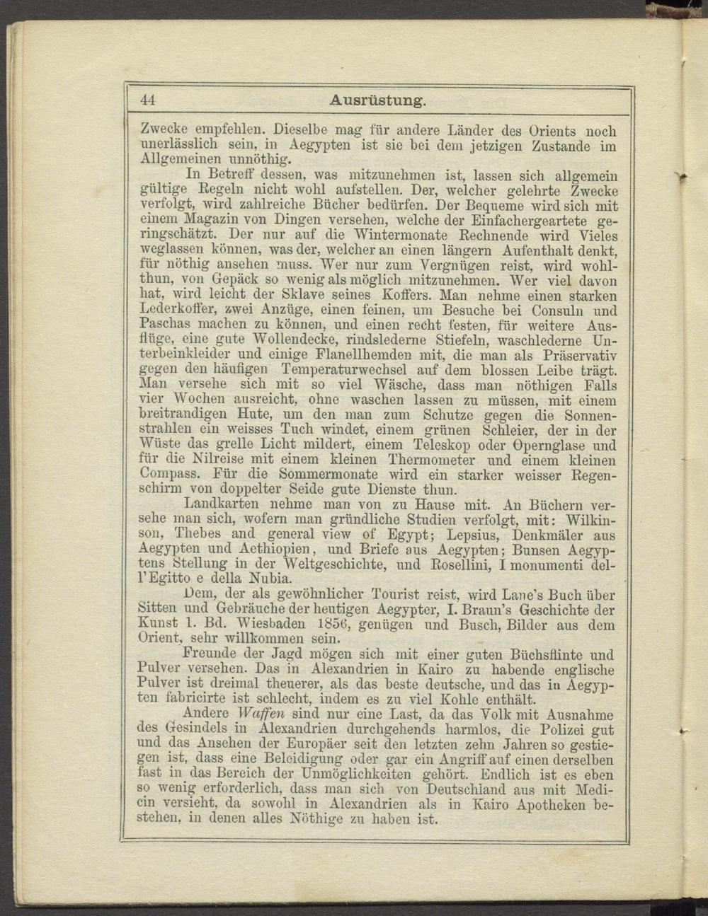 In Betreff dessen, was mitzunehmen ist, lassen sich allgemein gültige Kegeln nicht wohl aufstellen. Der, welcher gelehrte Zwecke verfolgt, wird zahlreiche Bücher bedürfen. Der Bequeme wird sich mit einem Magazin von Dingen versehen, welche der Einfachergeartete geringschätzt. Der nur auf die Wintermonate Rechnende wird Vieles weglassen können, was der, welcher an einen langem Aufenthalt denkt, für nöthig ansehen muss. Wer nur zum Vergnügen reist, wird wohl- thun, von Gepäck so wenig als möglich mitzunehmen. Wer viel davon hat, wird leicht der Sklave seines Koffers. Man nehme einen starken Lederkoffer, zwei Anzüge, einen feinen, um Besuche bei Consuln und Paschas machen zu können, und einen recht festen, für weitere Ausflüge, eine gute Wollendecke, rindslederne Stiefeln, waschlederne Unterbeinkleider und einige Flanellhemden mit, die man als Präservativ gegen den häufigen Temperaturwechsel auf dem blossen Leibe trägt. Man versehe sich mit so viel Wäsche, dass man nöthigen Falls vier Wochen ausreicht, ohne waschen lassen zu müssen, mit einem breitrandigen Hute, um den man zum Schutze gegen die Sonnenstrahlen ein weisses Tuch windet, einem grünen Schleier, der in der Wüste das grelle Licht mildert, einem Teleskop oder Opernglase und für die Nilreise mit einem kleinen Thermometer und einem kleinen Compass. Für die Sommermonate wird ein starker weisser Regenschirm von doppelter Seide gute Dienste tliun.