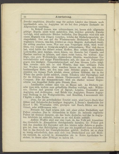 Landkarten nehme man von zu Hause mit. An Büchern versehe man sich, wofern man gründliche Studien verfolgt, mit: Wilkin- son, Thebes and general view of Egypt; Lepsius, Denkmäler aus Aegypten und Aethiopien, und Briefe aus Aegypten; Bunsen Aegyptens Stellung in der Weltgeschichte, und Rosellini, I monumenti del- l’Egitto e della Nubia.